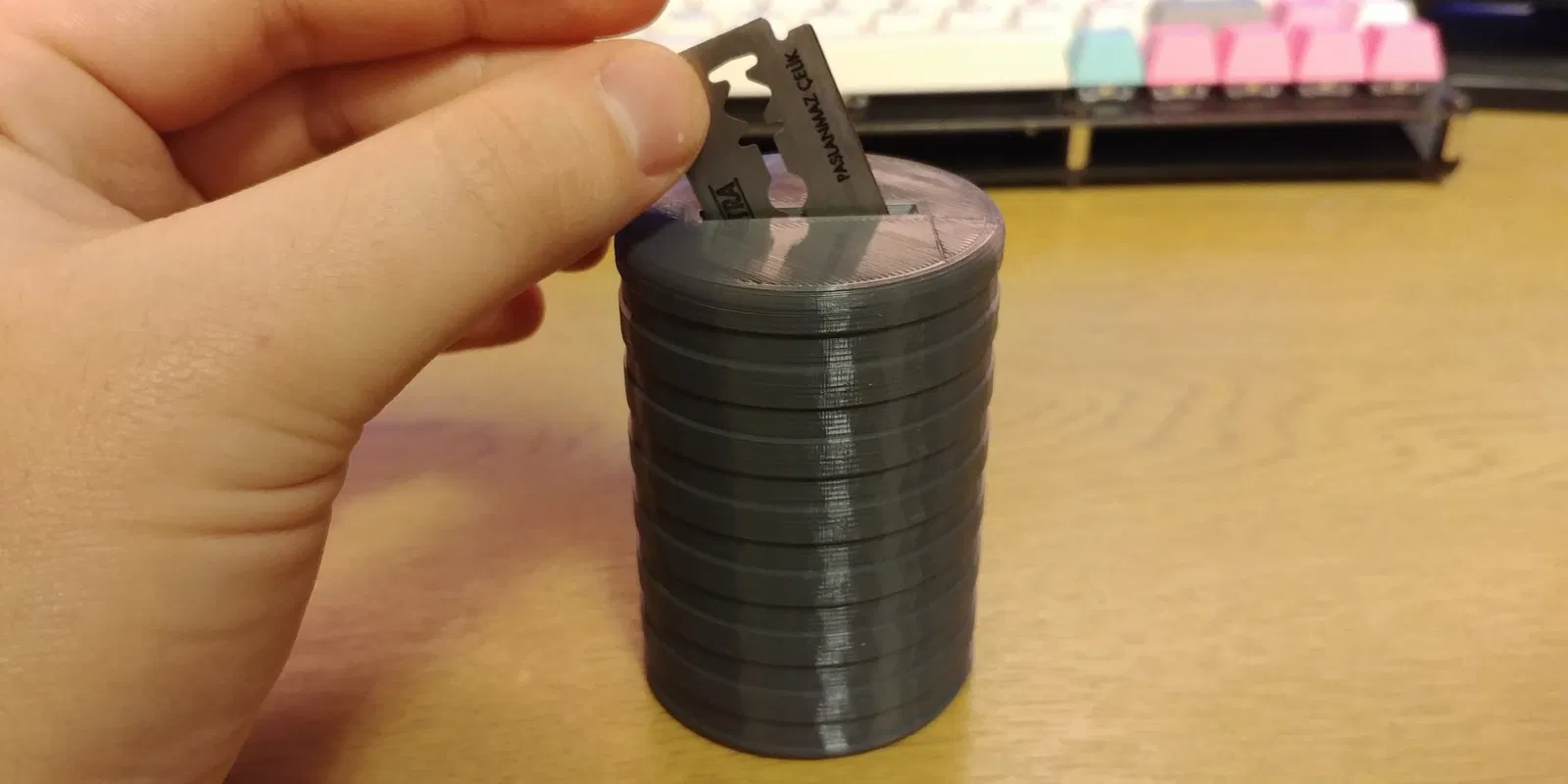 Một thùng xử lý lưỡi có thể in 3D, phù hợp với bất kỳ lưỡi dao cạo nào với kích thước của dao cạo an toàn cạnh đôi.