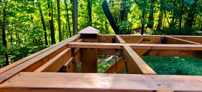 Mình mới lắp một cái pergola nhưng không thích việc phần đầu các trụ bị để hở ngoài trời. Mình chọn cách làm hơi cầu kỳ hơn và thiết kế một nắp che dạng hai mảnh để hạn chế nước thấm vào và làm gỗ bị ngấm (phần thớ gỗ lộ ra ngoài trời rất dễ hút nước nhanh).