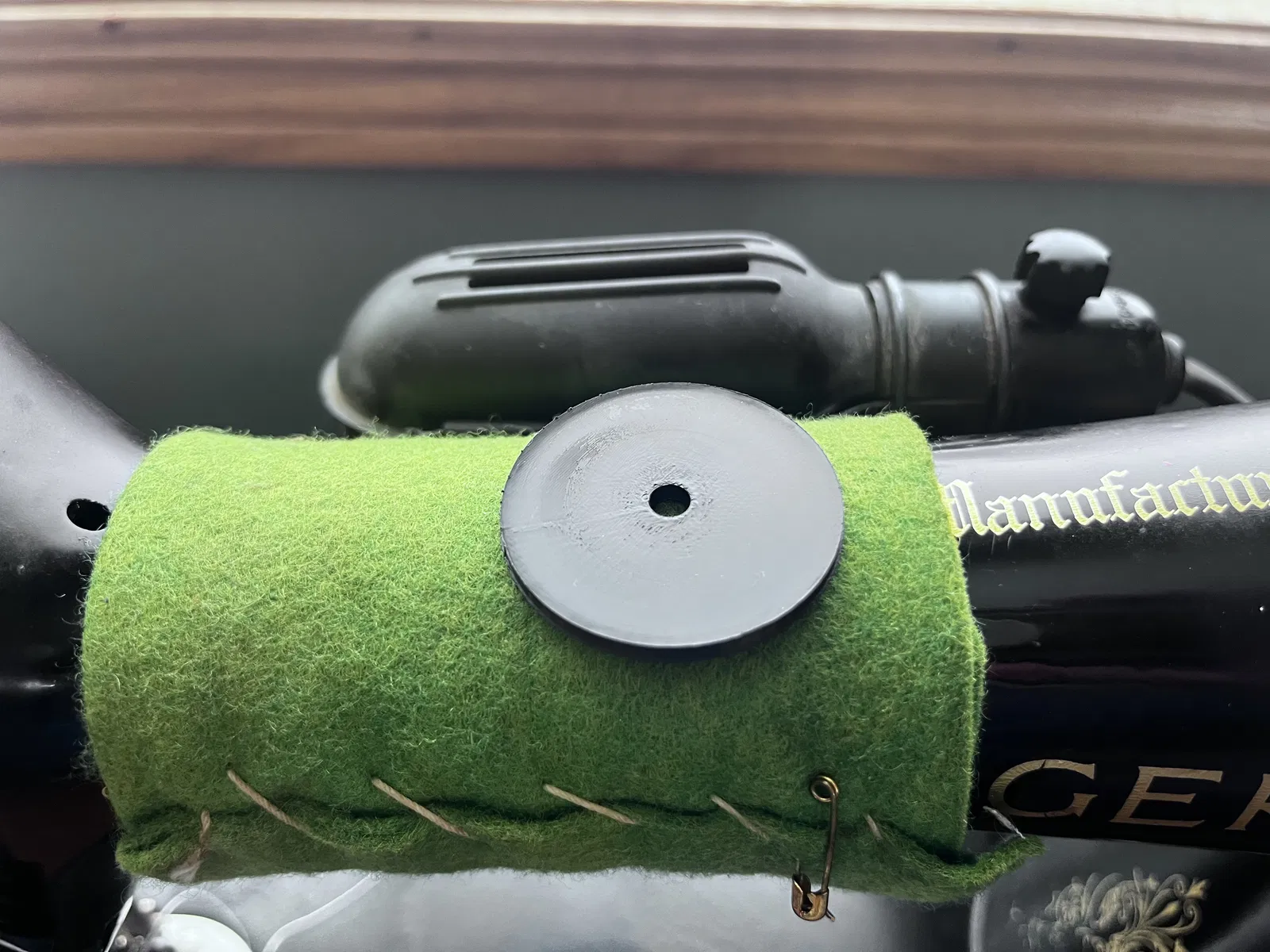 Miếng washer/bảo vệ cuộn chỉ cho máy may Singer đời cũ, giúp cuộn chỉ không cọ làm mòn/trầy lớp sơn. Thay cho cách thường dùng là lót một miếng nỉ (felt) bên dưới.