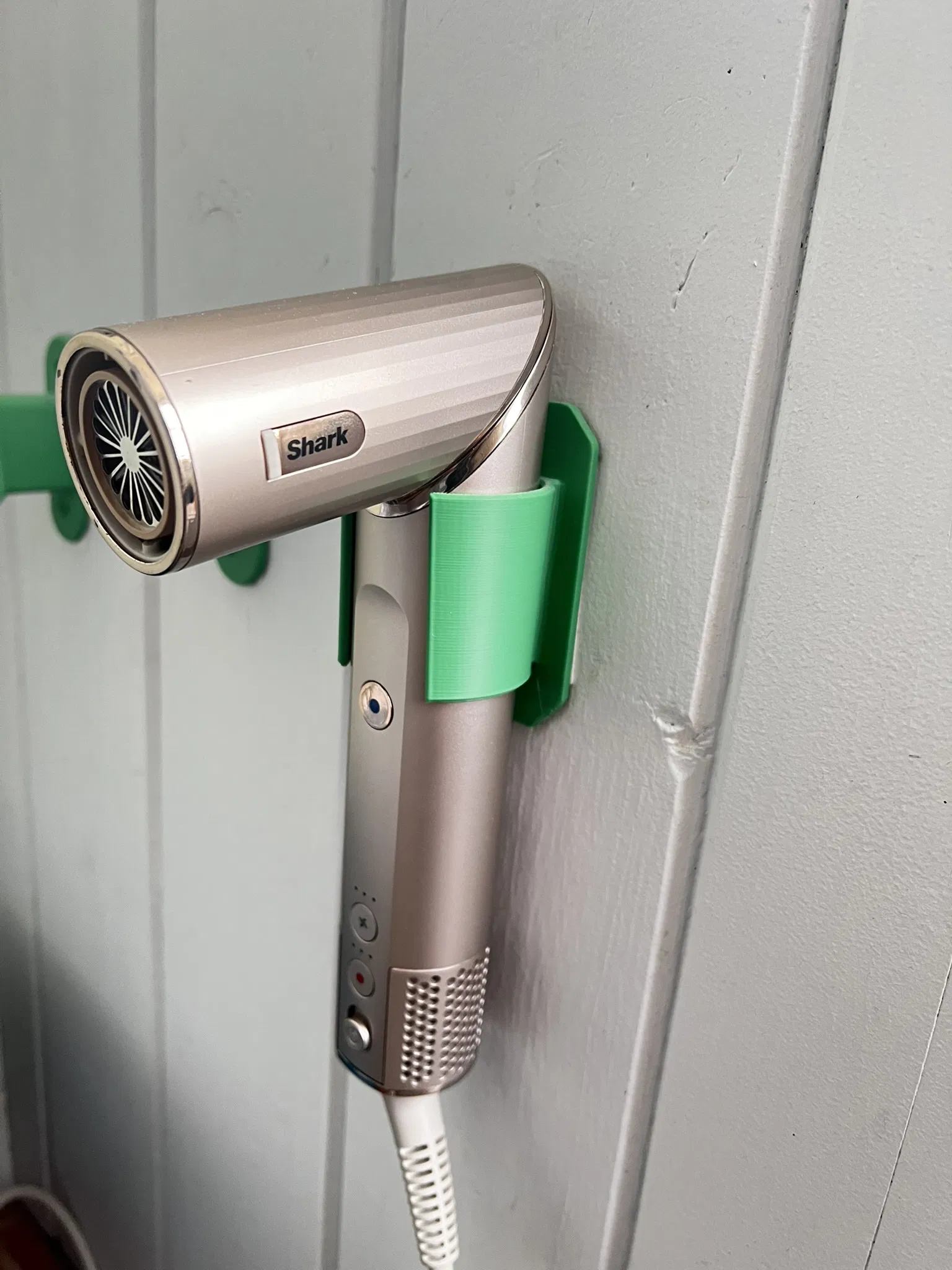Giá treo tường in 3D để cất gọn Shark Air Wrap cạnh bàn trang điểm. Có thể dán bằng băng keo hai mặt hoặc bắt vít qua lỗ có sẵn. Thân giá loe nhẹ xuống dưới để giữ máy chắc, kèm mũi tên chỉ hướng lắp.