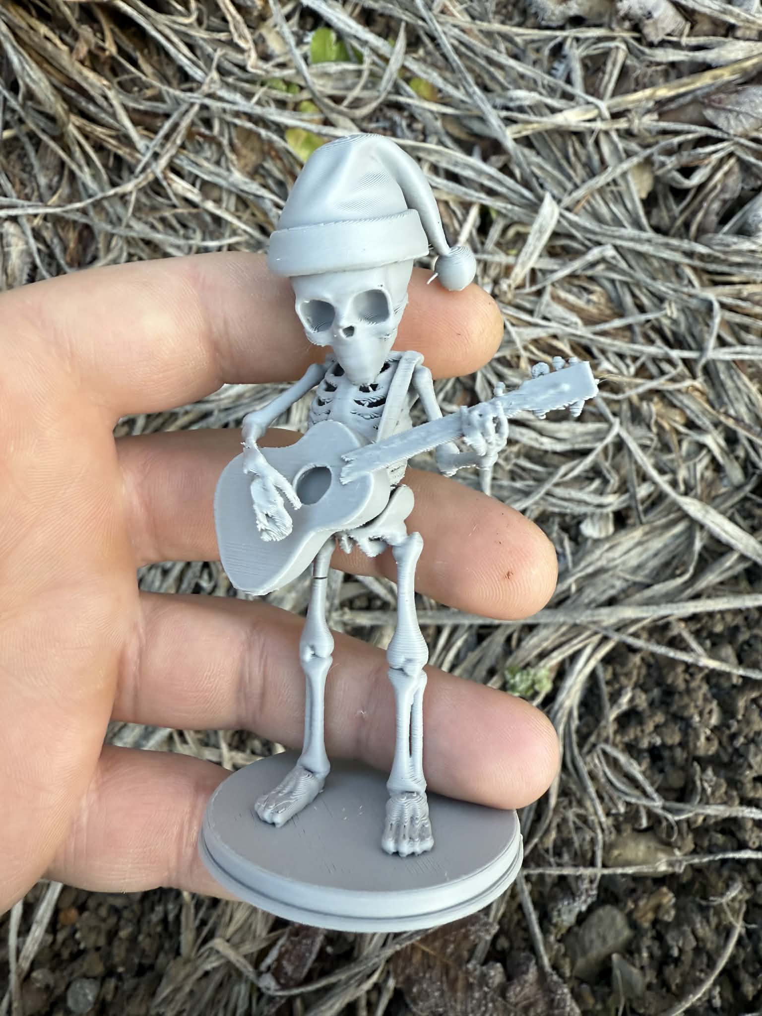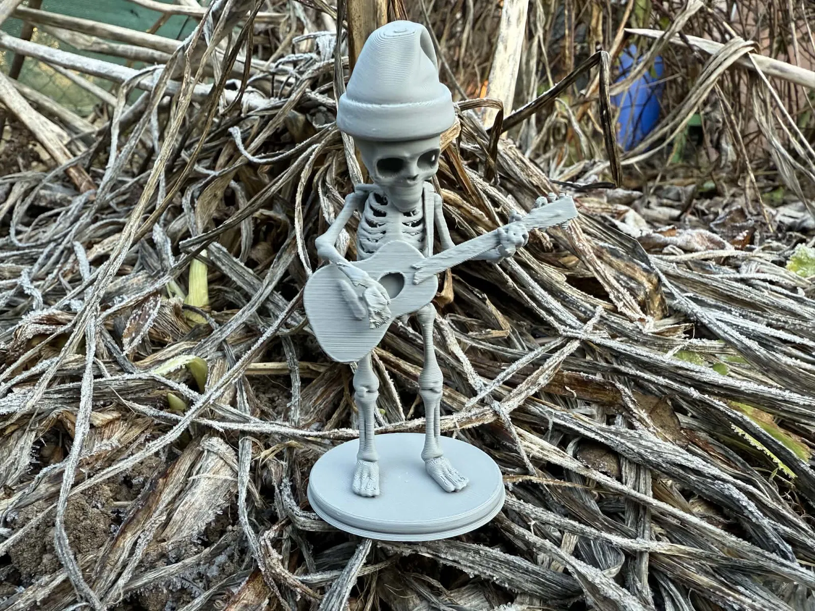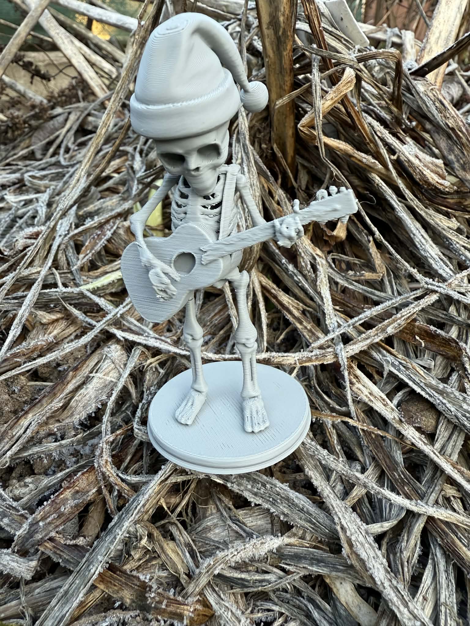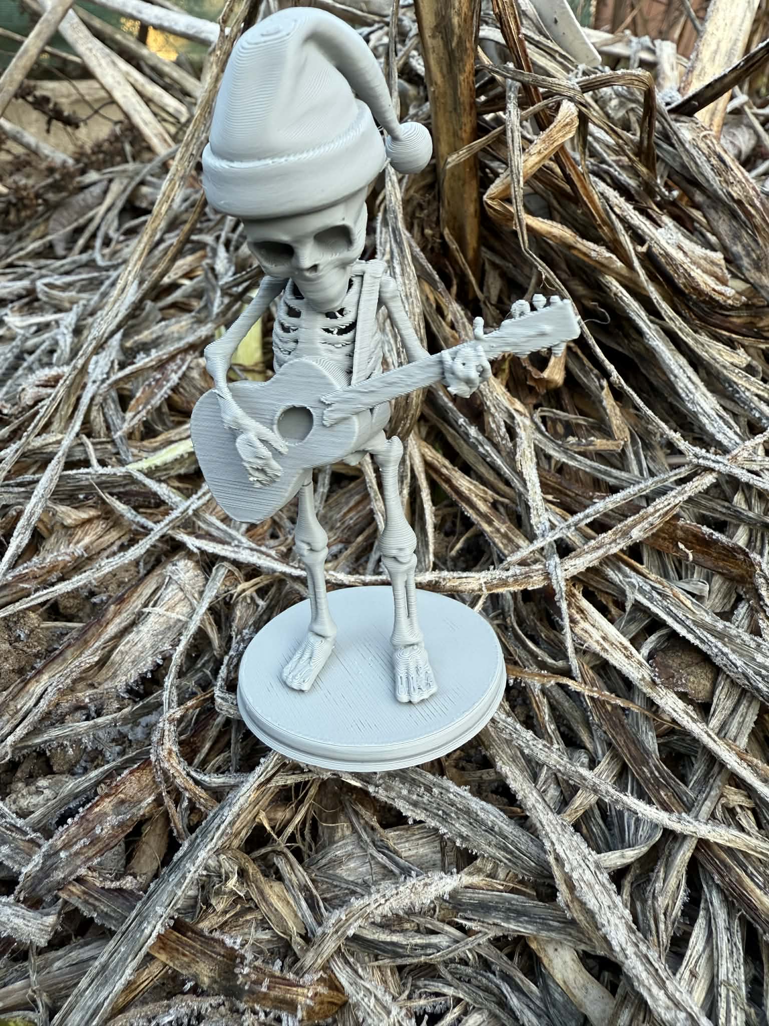 Mẫu Winter skeleton với cây guitar đặt trên giá đỡ, tạo dáng ngầu và hợp trang trí Halloween. In bằng PLA/PETG và bắt buộc dùng supports. Thích hợp để in xong rồi sơn/tô màu cho vui.