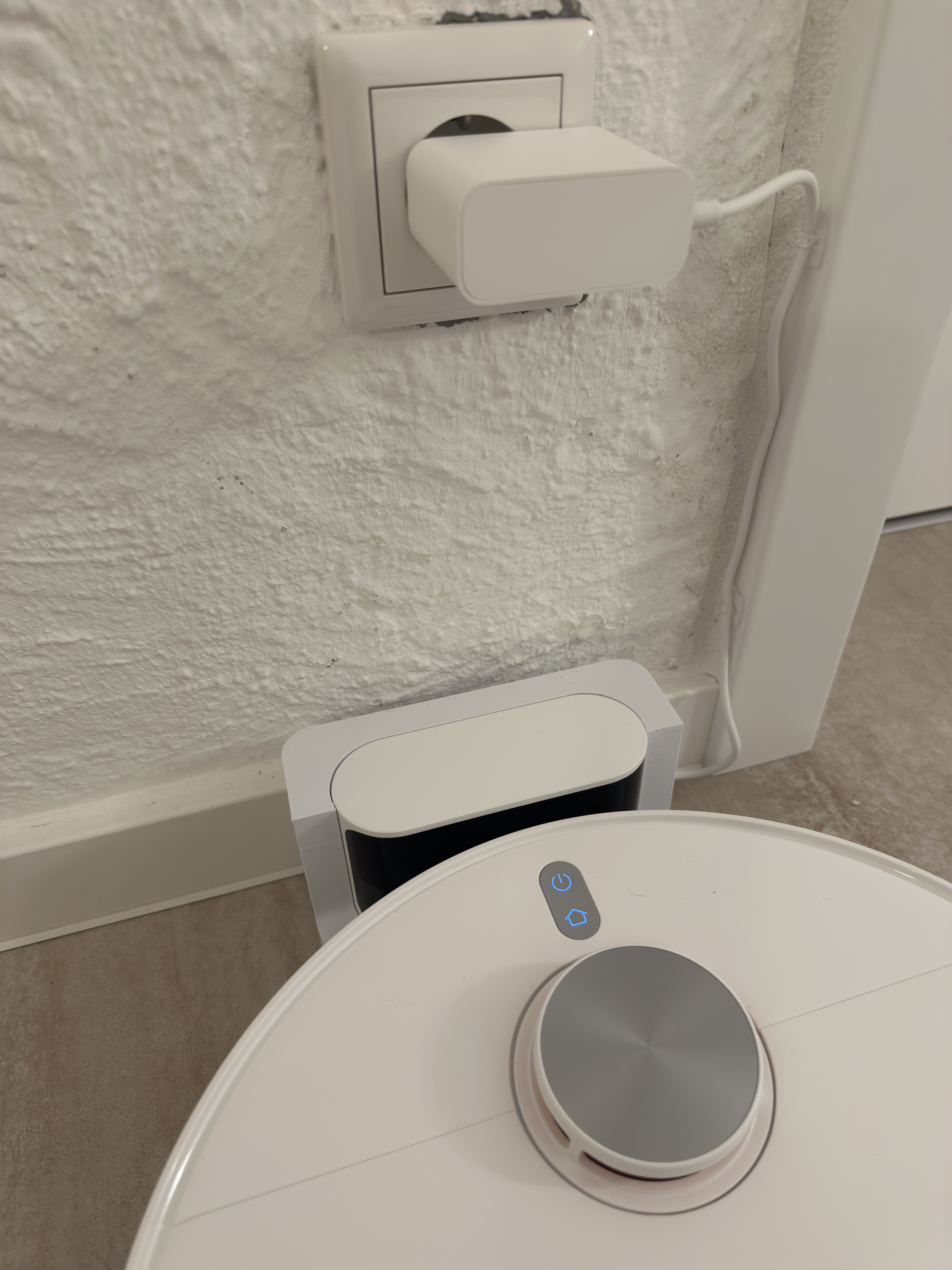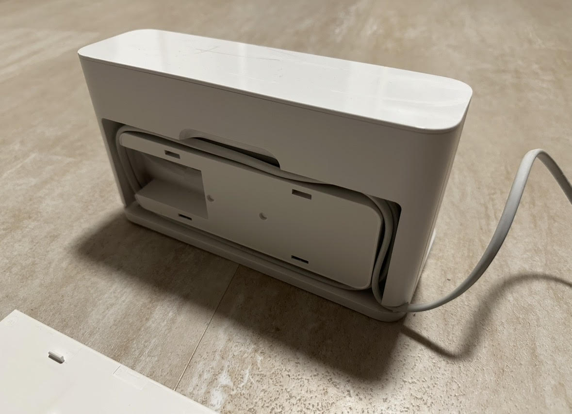 Các dock robot hút bụi Xiaomi / Mija đời cũ có sẵn một bộ cuốn/giấu dây gọn gàng ở mặt sau dock: