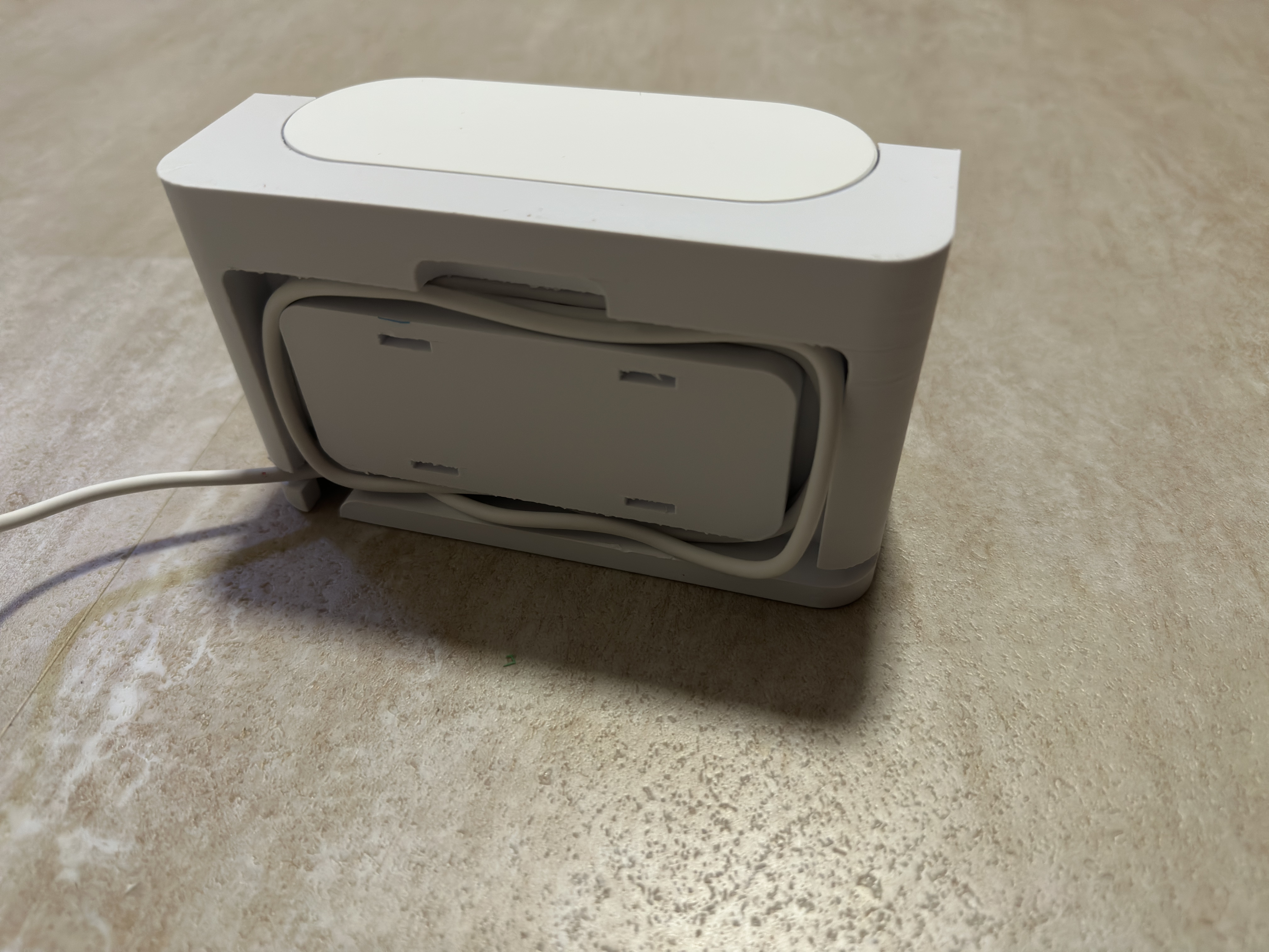 Khay cất dây dành cho nhiều loại dock robot hút bụi Xiaomi, mô phỏng phần giấu dây của dock đời cũ. Trượt lắp lên dock hiện có, có 2 đường đi dây trái/phải. Dễ in, khuyên dùng supports.
