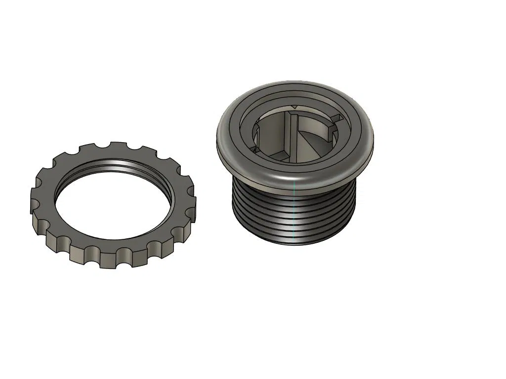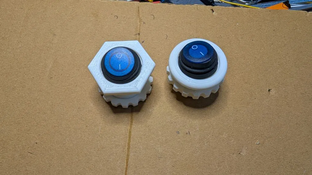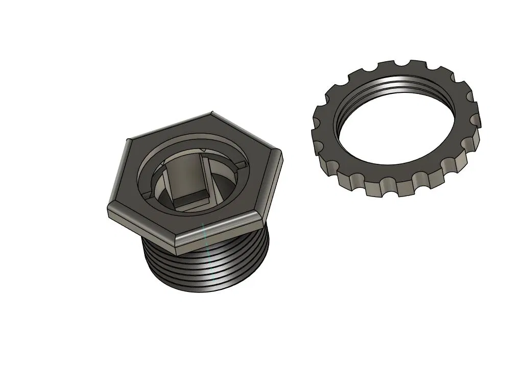 Mình đã vẽ một bản thay thế để khắc phục các điểm yếu đó. Mount của mình dành cho lỗ 30mm. Ren được làm thô hơn một chút để tăng độ bám khi siết. Model cho độ ổn định và retention tốt hơn: cần ấn lực chắc tay để lắp công tắc vào mount, và cũng cần lực tương tự để tháo ra.