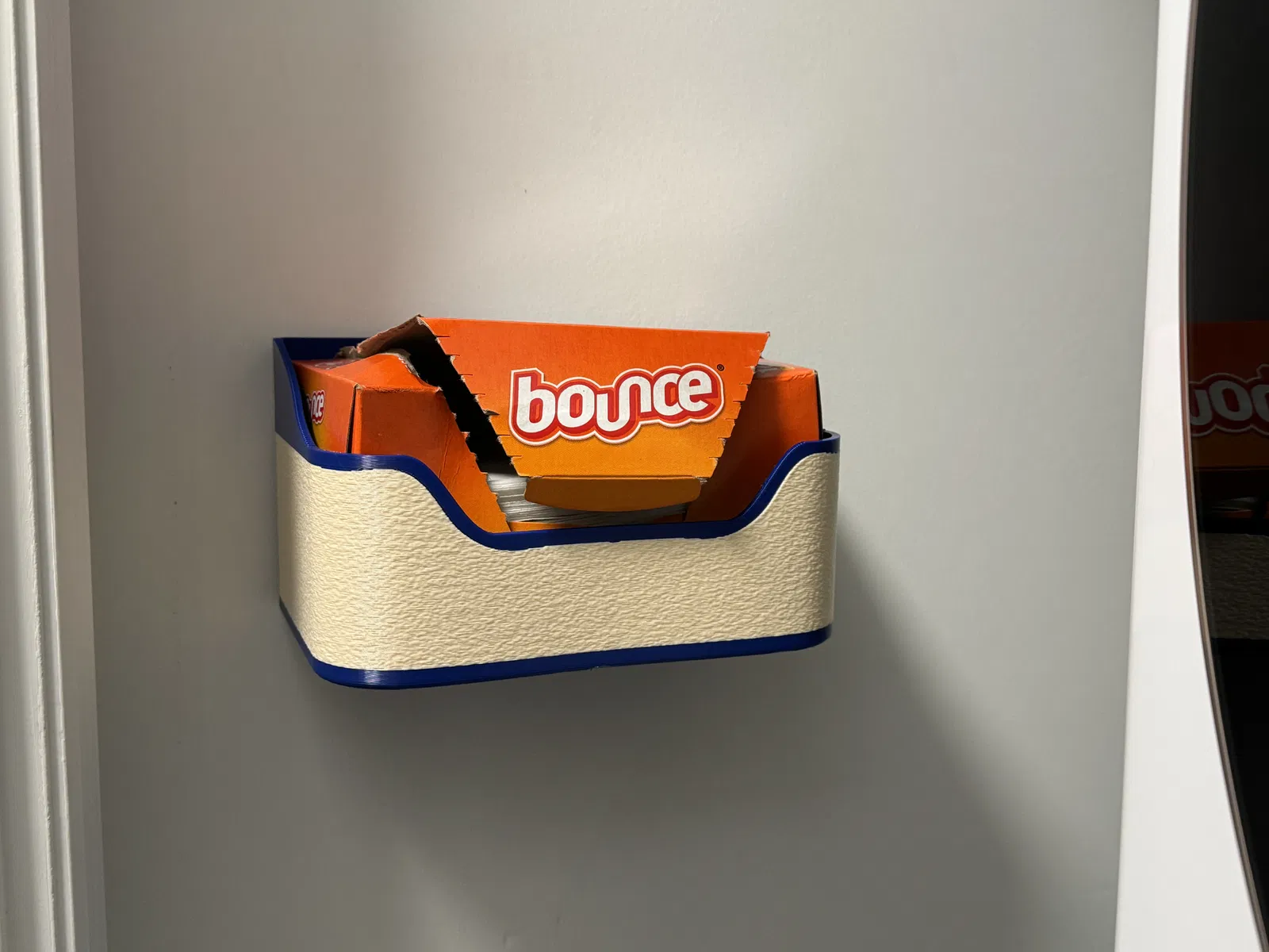Hộp/khay đựng dryer sheet gắn tường. Rất hợp cho không gian nhỏ. Có 3 phần gờ nổi (emboss) để dán bằng miếng dán 3M loại lớn. Thiết kế dành cho Bounce sheets. Nhớ lau sạch tường trước khi dán miếng dán.