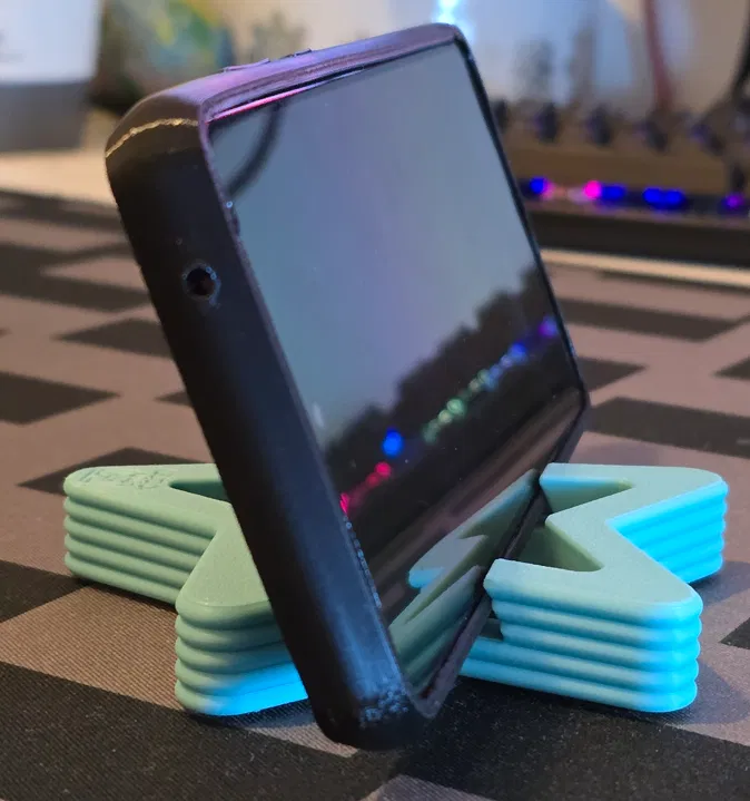 Kệ đỡ điện thoại kiểu gọn gàng, nhìn cưng. Dễ in với supports được tích hợp sẵn trong thiết kế (xem hình). Có kèm chân TPU 95A chống trượt, hoặc có thể dùng miếng đệm tự dán dạng bubble 10mm.