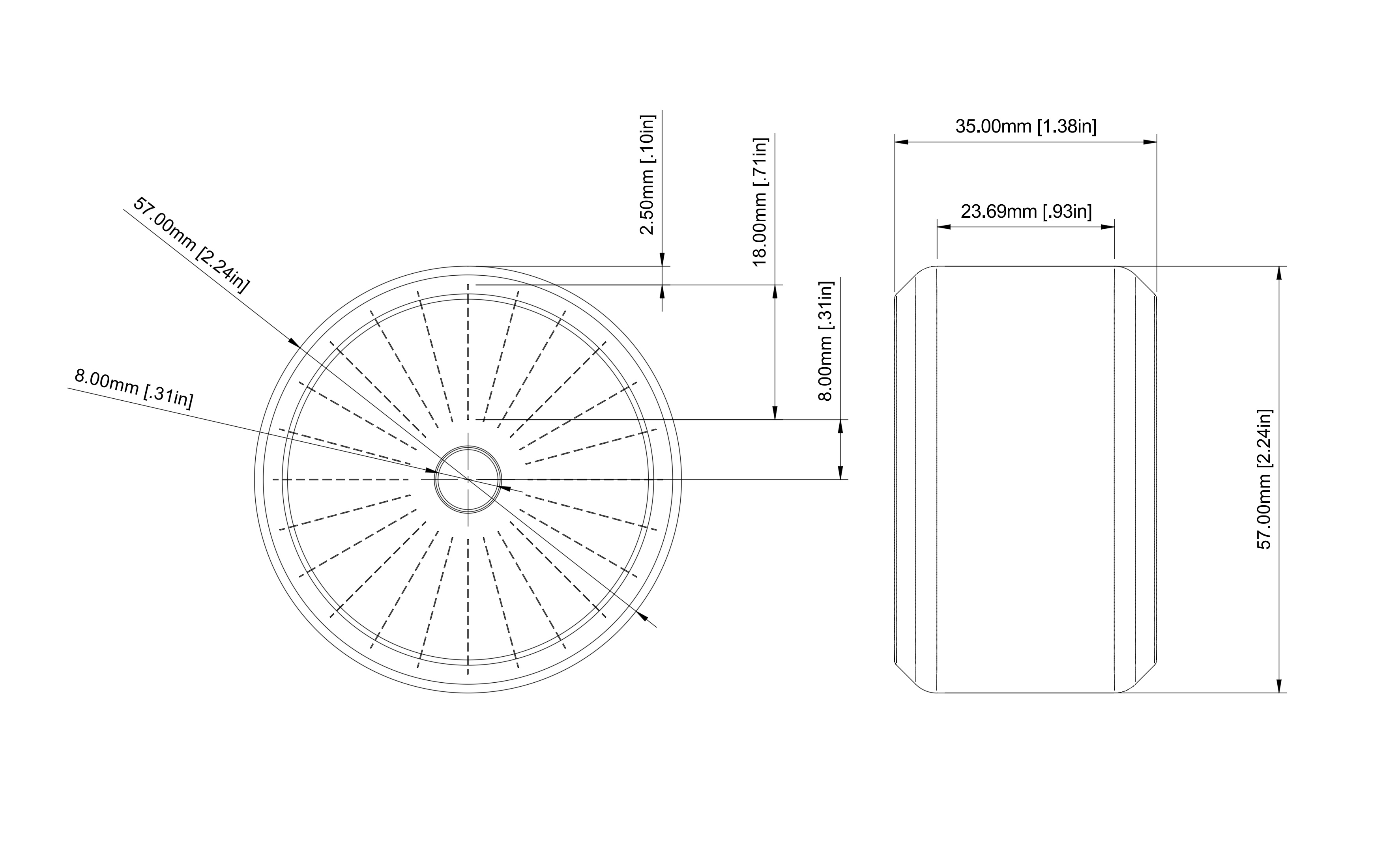Mẫu bánh xe nhựa 57mm, lỗ trục 8mm để thay bánh xe rẻ tiền. Bên trong có 24 rãnh để slicer tạo 24 spoke tăng cứng vững; độ bền tùy theo wall/infill. Gợi ý: 3 walls, 15% gyroid.