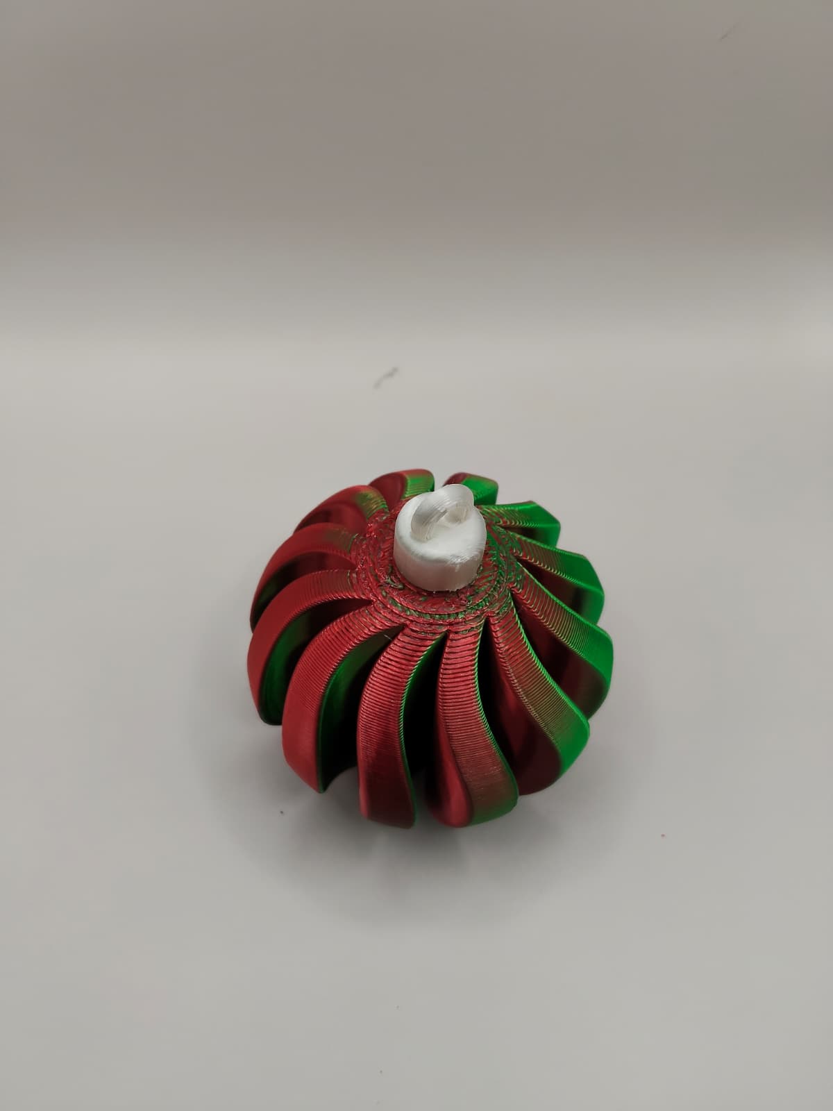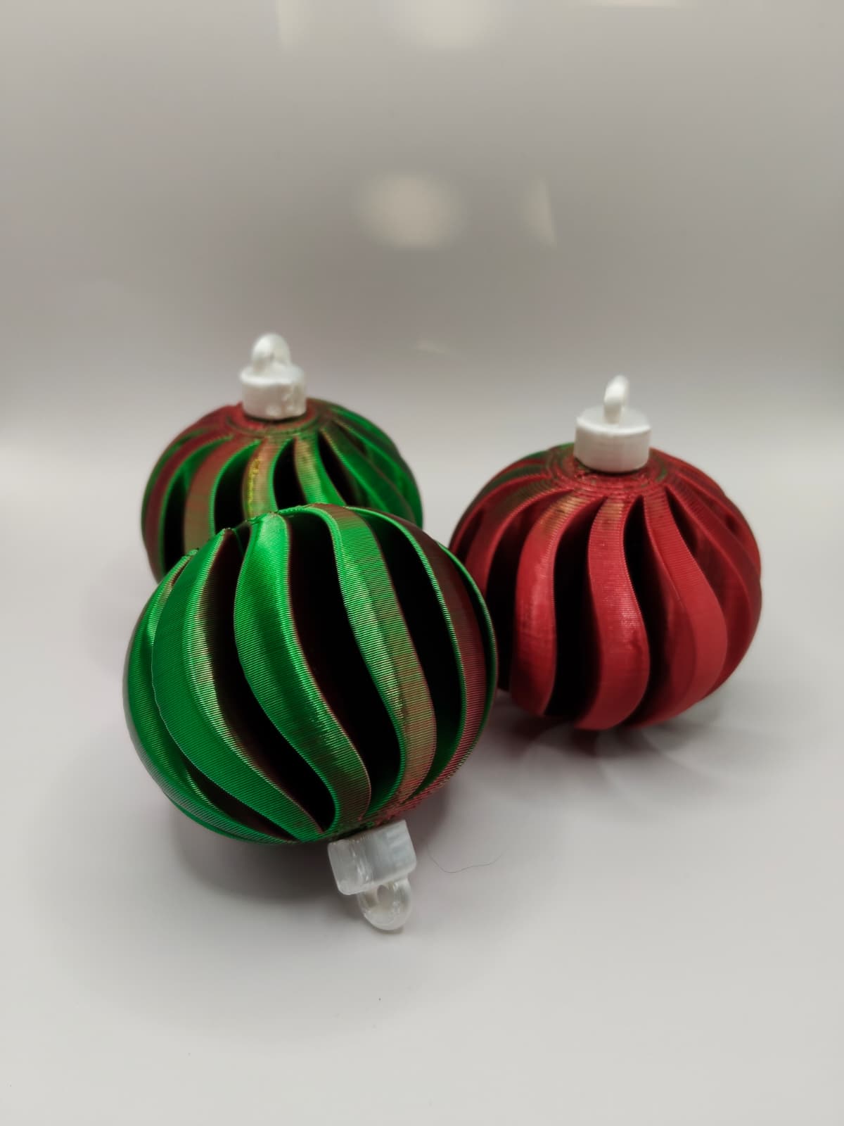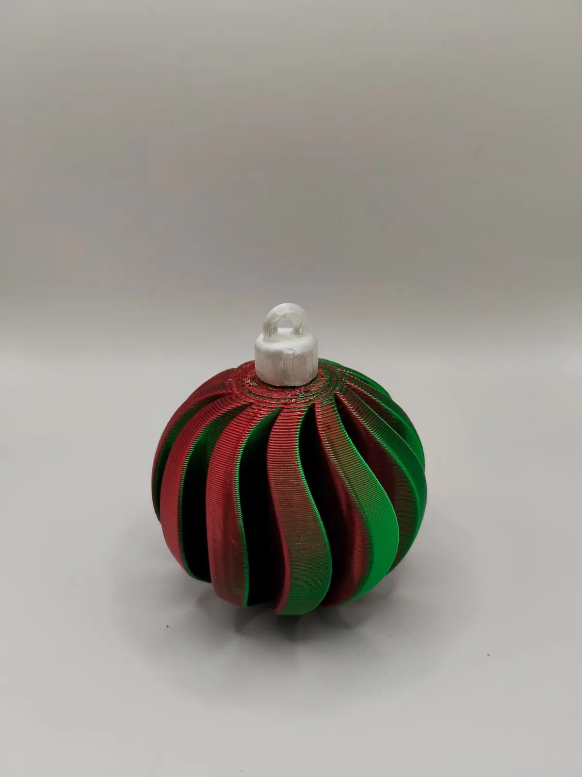 Mẫu Christmas bauble xoắn ốc phối đỏ–xanh lá, nhìn hiện đại mà vẫn đúng không khí Noel. In PLA hoặc PETG, nên in độ phân giải cao để ra chi tiết; có thể cần supports cho khoen trên và vặn nắp để lắp ráp.