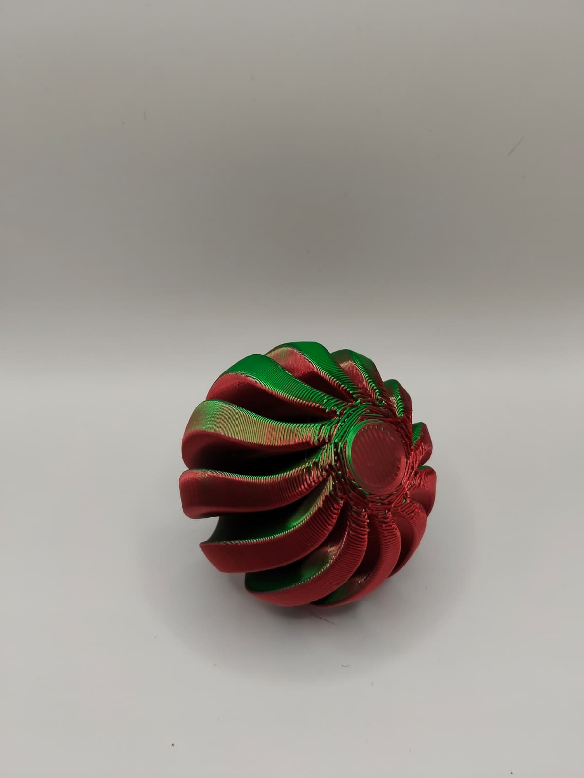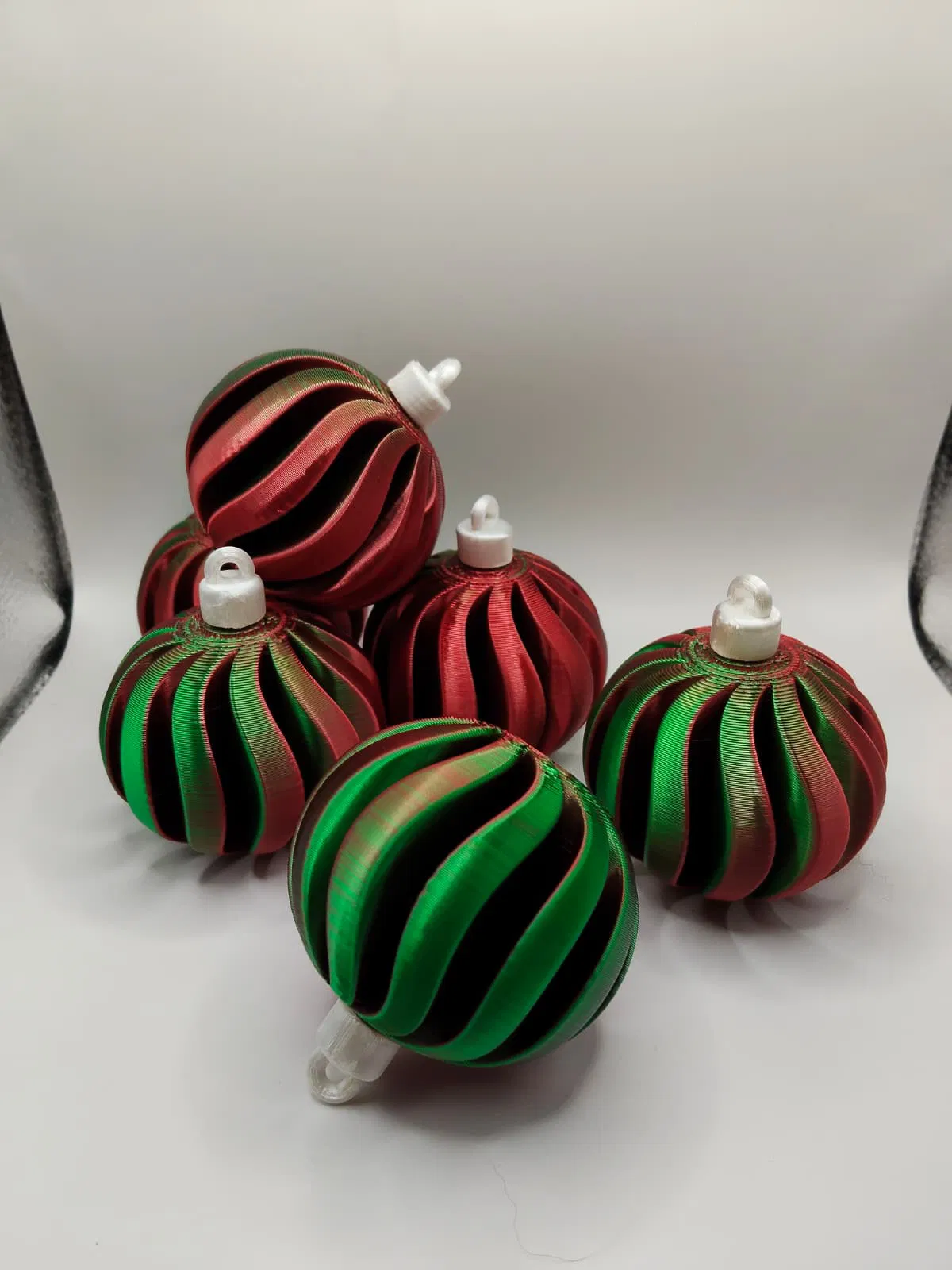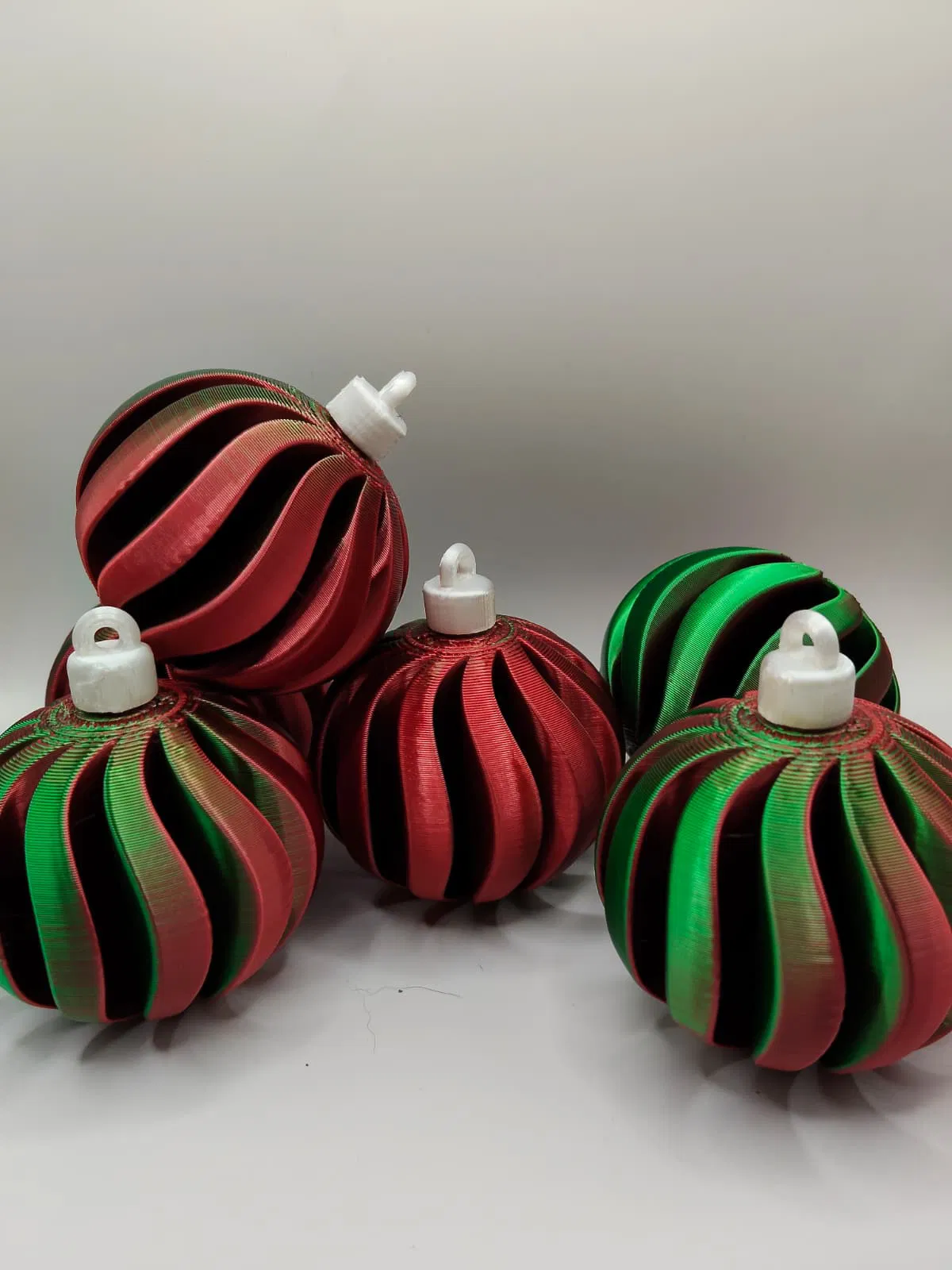 Mẫu Christmas bauble xoắn ốc phối đỏ–xanh lá, nhìn hiện đại mà vẫn đúng không khí Noel. In PLA hoặc PETG, nên in độ phân giải cao để ra chi tiết; có thể cần supports cho khoen trên và vặn nắp để lắp ráp.