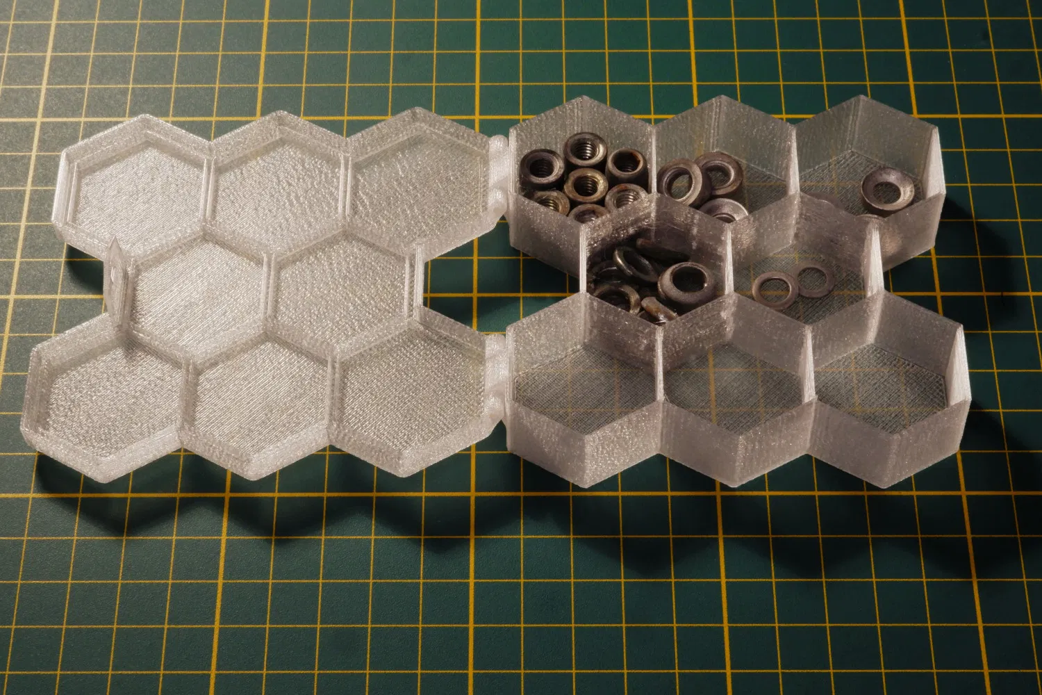 Hộp chia ngăn lục giác tuỳ chỉnh số lượng và kích thước, có nắp bản lề và chốt gài để đóng chắc. File .scad tạo thân + nắp, dùng đoạn filament làm chốt; in ngon không cần support.