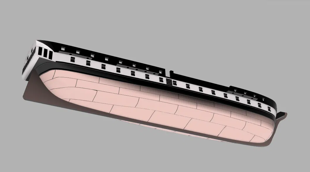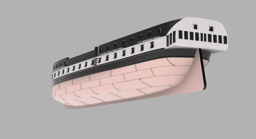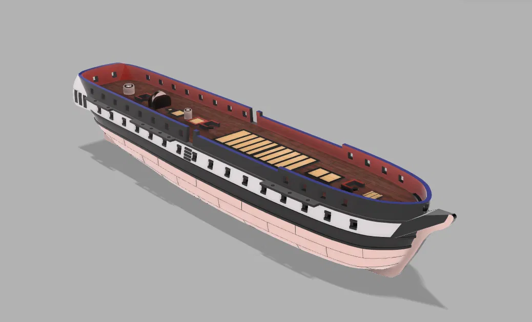 Tàu frigate chạy buồm gồm 2 phần. Thân tàu (hull) in ở 100% infill để làm ballast. Sàn tàu (deck) in riêng với mức infill bạn hay dùng. Deck có ngàm để trượt vào hull rồi dán keo :)