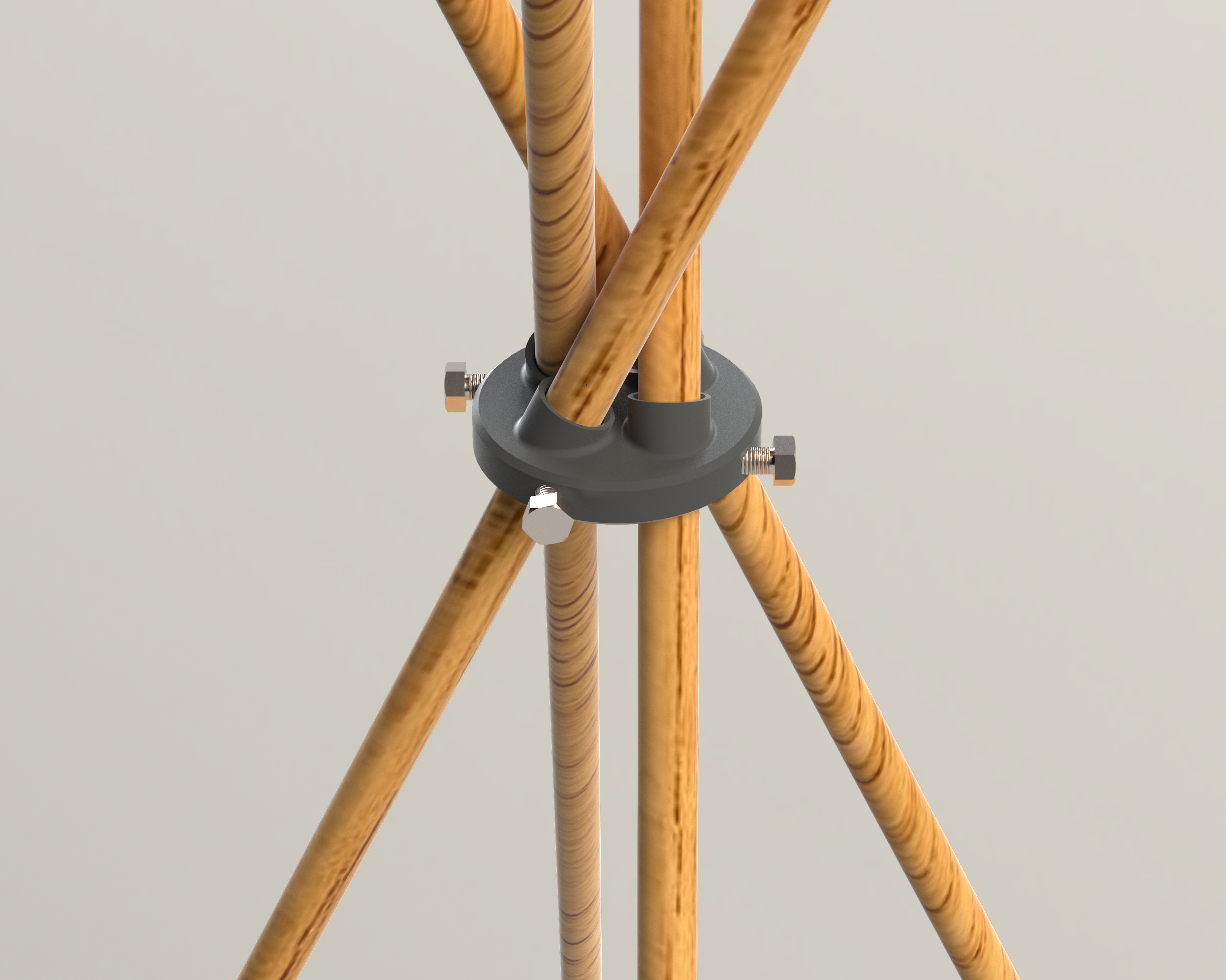 Bracket giúp canh thẳng và cố định các tent pole khi dựng lều teepee cho bé, giảm cảnh phải cần 2 người. Có bản 4 hoặc 5 cọc, dùng bu lông M8x20 và cap thành thumb screw. Lỗ Ø19mm, có thể chỉnh theo nhu cầu.
