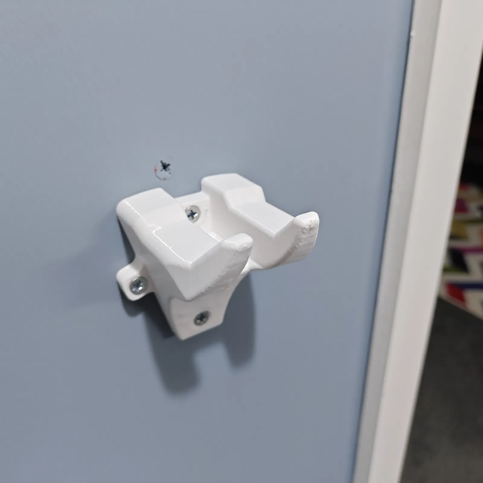 Móc treo tường chắc chắn cho balo/túi với 4 lỗ vít 5mm, bề mặt bo tròn chống mòn quai, 2 ngạnh dẫn quai, khe móc ngón tay 18mm và khoảng hở 25mm khỏi tường. In PETG, in úp mặt phẳng xuống.