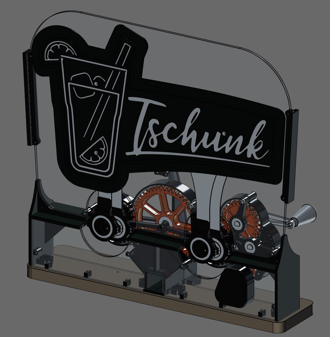 Bảng hiệu Tschunk quay tay dạng chase light, dùng motor làm máy phát điện. File STEP cung cấp “as is”; có thể tách từng phần bằng CAD hoặc PrusaSlicer (right click → split into parts). Cơ cấu giống mẫu marquee cho Hackaday Berlin.
