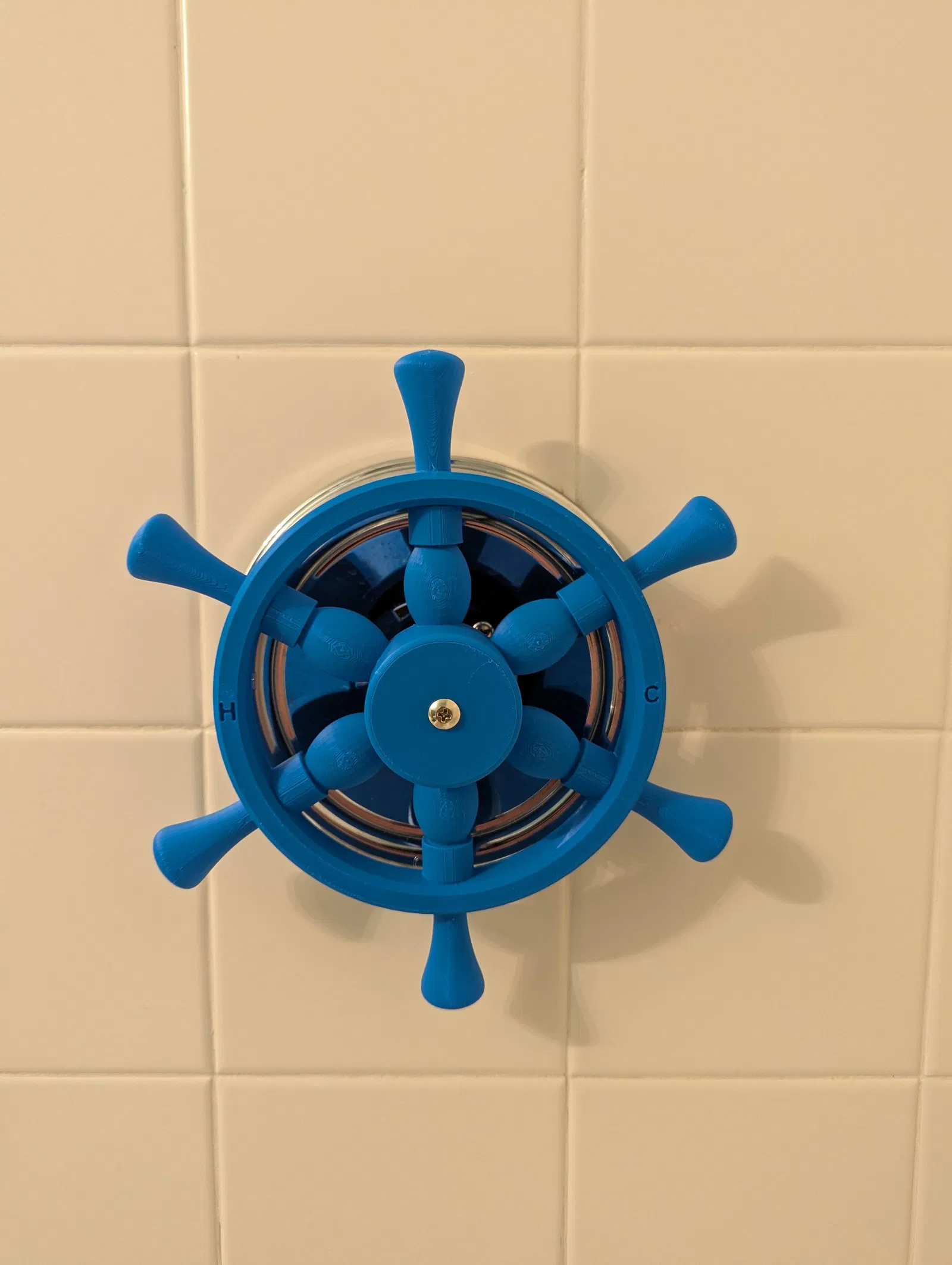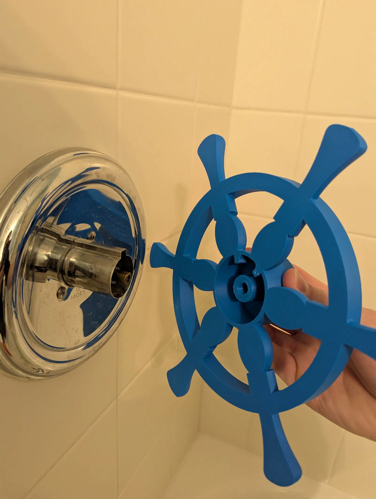 Tay vặn thay thế cho vòi bồn tắm Moen, tạo hình bánh lái tàu cướp biển. Fit được thiết kế ôm chặt trục van; nên in test phần lỗ valve stem trước để canh dung sai và chỉnh scale nhẹ nếu cần.