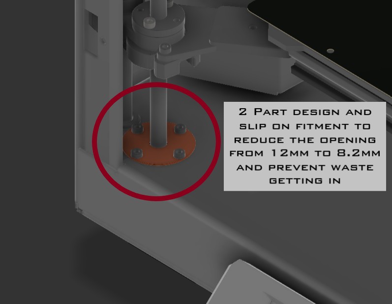 Bộ nắp chắn bụi dạng chụp (2 mảnh) cho Prusa Core One/Core One L, giúp thu nhỏ lỗ quanh lead screw để hạn chế bụi và mảnh vụn rơi vào base và stepper motor. Không cần tháo ốc Allen.