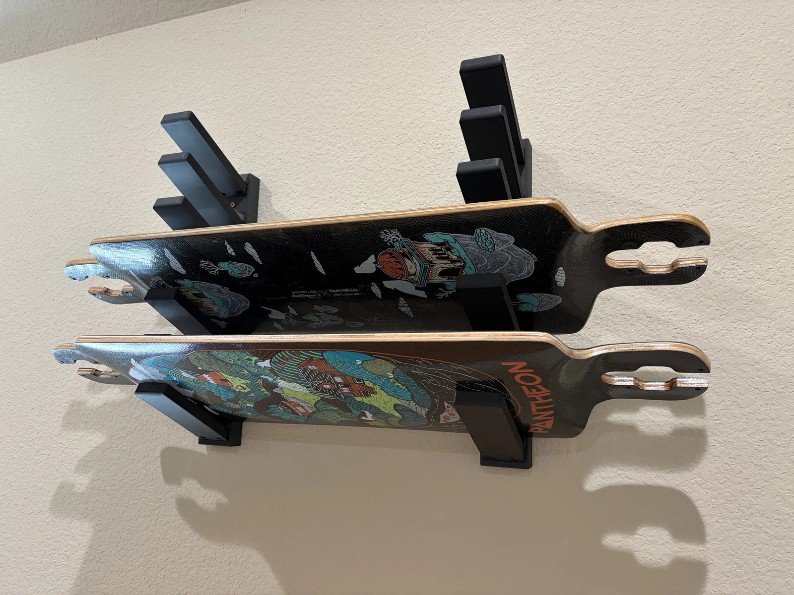 Kệ treo tường dành cho deck longboard hoặc skateboard. Thiết kế tối ưu cho việc treo deck không gắn bánh/trucks, dùng ốc M5. In trên bàn 350x350; có thể cắt bớt tầng trên để hợp máy nhỏ.