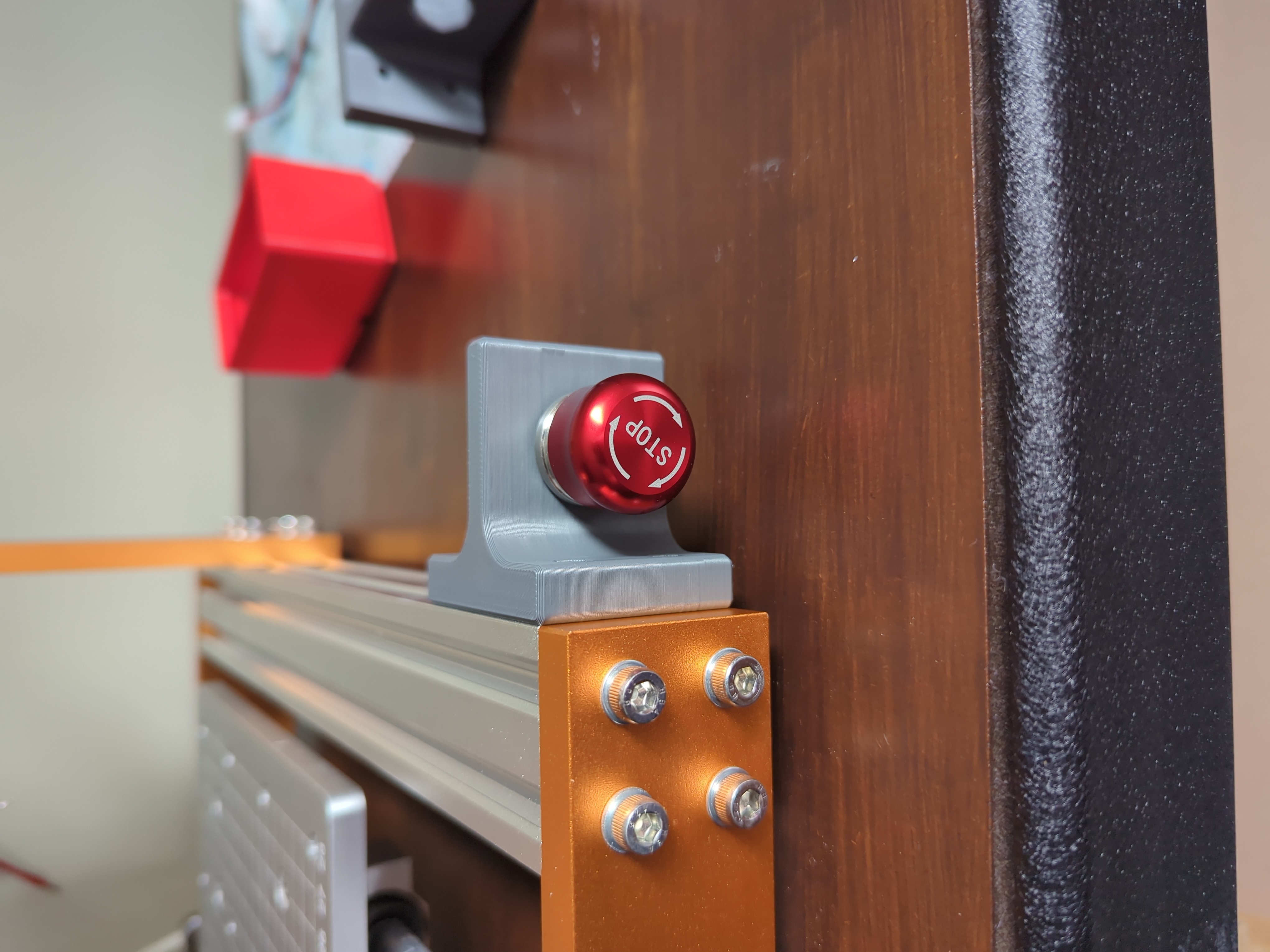 Vị trí mặc định của nút emergency stop trên các máy kiểu 3018 của Lunyee thật sự chưa tối ưu. Bạn phải với tay ngang qua máy, nhẹ thì bất tiện, nặng thì khá nguy hiểm. Ngoài ra, đi dây ở vị trí đó rất khó quản lý cho gọn gàng để tránh xa các bộ phận đang chuyển động. Nút emergency stop phải dễ với tới, an toàn khi thao tác, và đặt ở chỗ dễ thấy.