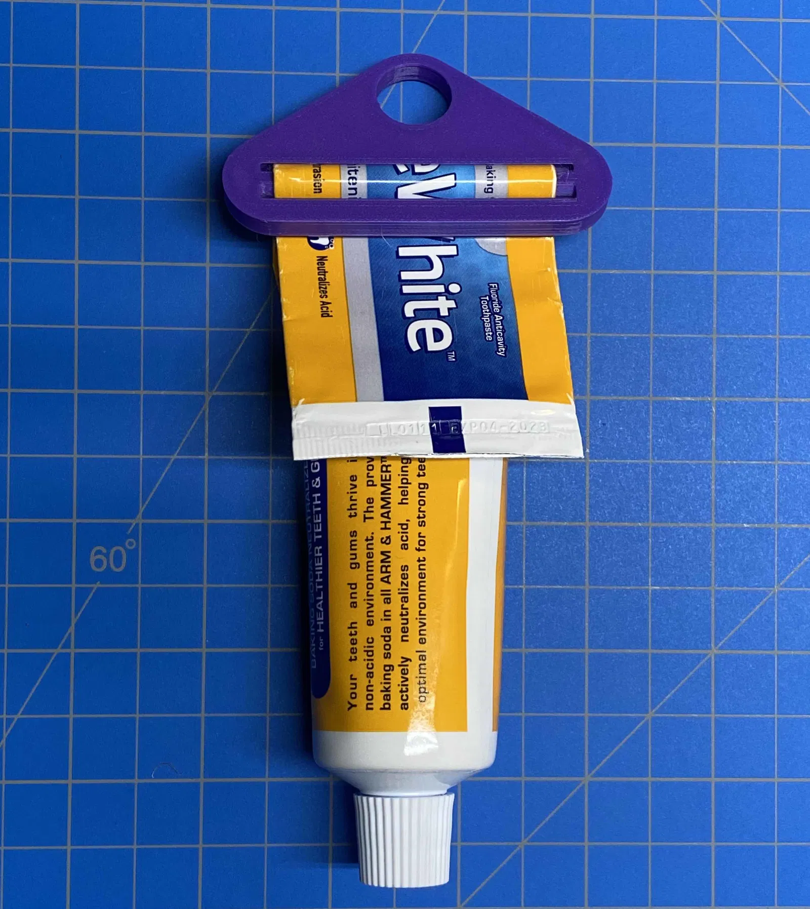 Remix bộ bóp kem đánh răng để nới rộng lỗ cho treo được và thêm khe thứ hai để luồn ống lại, chống tuột khi treo. Khe đôi cũng giữ ống không trượt ngược ngay cả khi không treo.