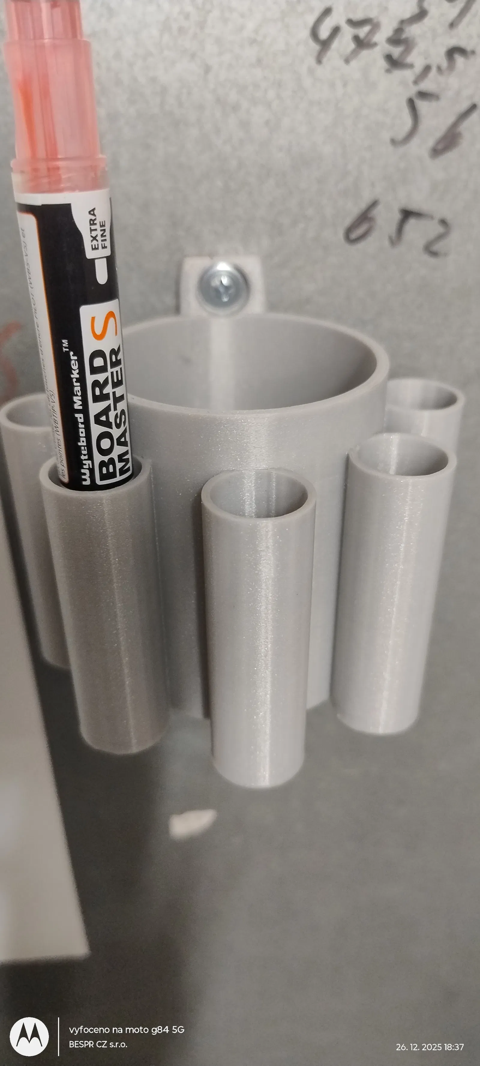Giá đỡ phụ kiện cho whiteboard dùng để cất bút lông bảng và chai xịt vệ sinh. In bằng PLA, chỉ cần bắt vít gần bảng là gọn gàng, tiện lấy dùng ngay.