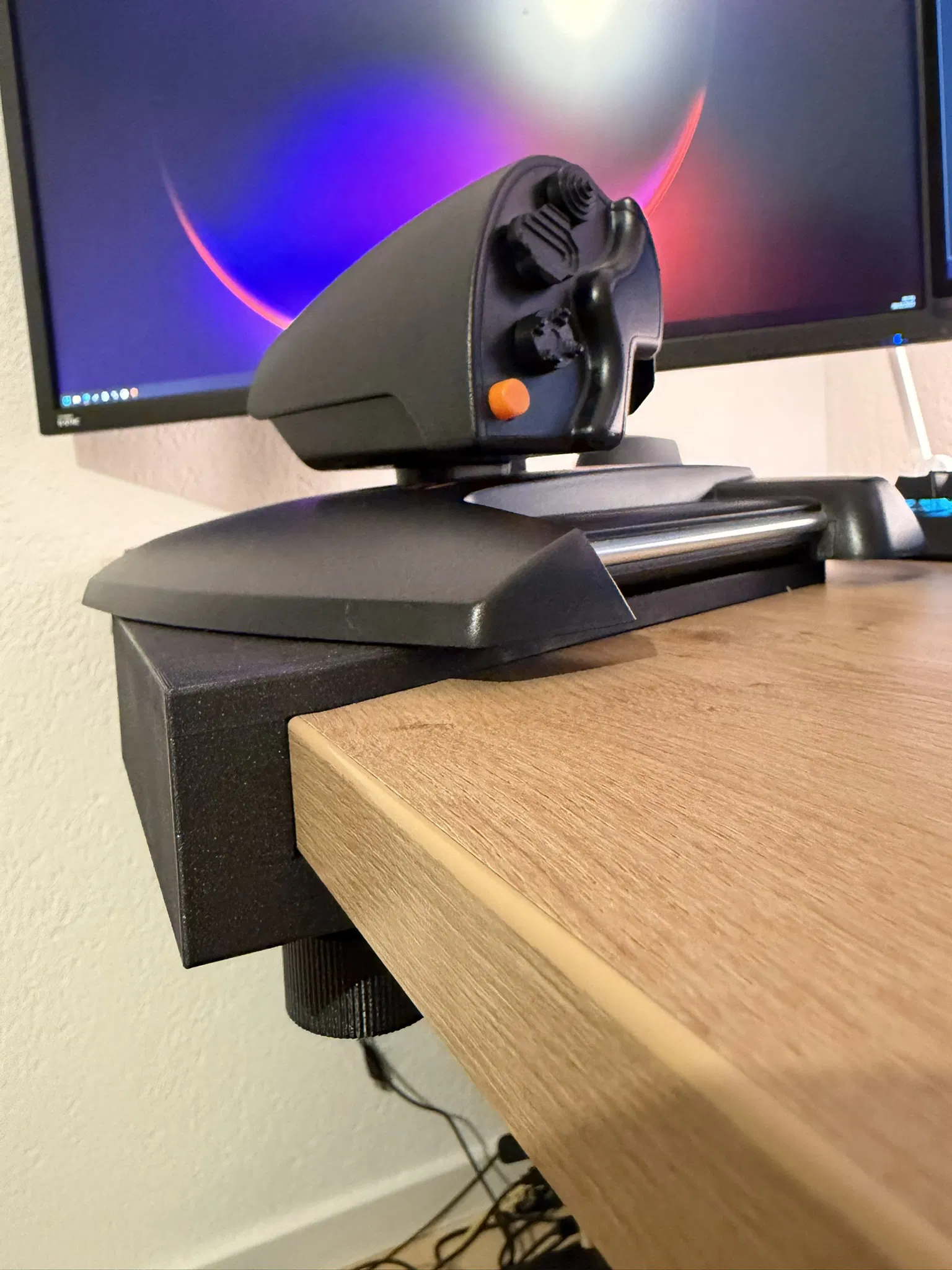 Đế gắn Thrustmaster TWCS Throttle lên bàn theo góc 20°, giúp hết bị trượt khi kéo/đẩy throttle. Tương thích bàn dày 8–35mm, cần 2 vít M6x16 mm. File .3mf có printingsettings, in trên CoreOne.