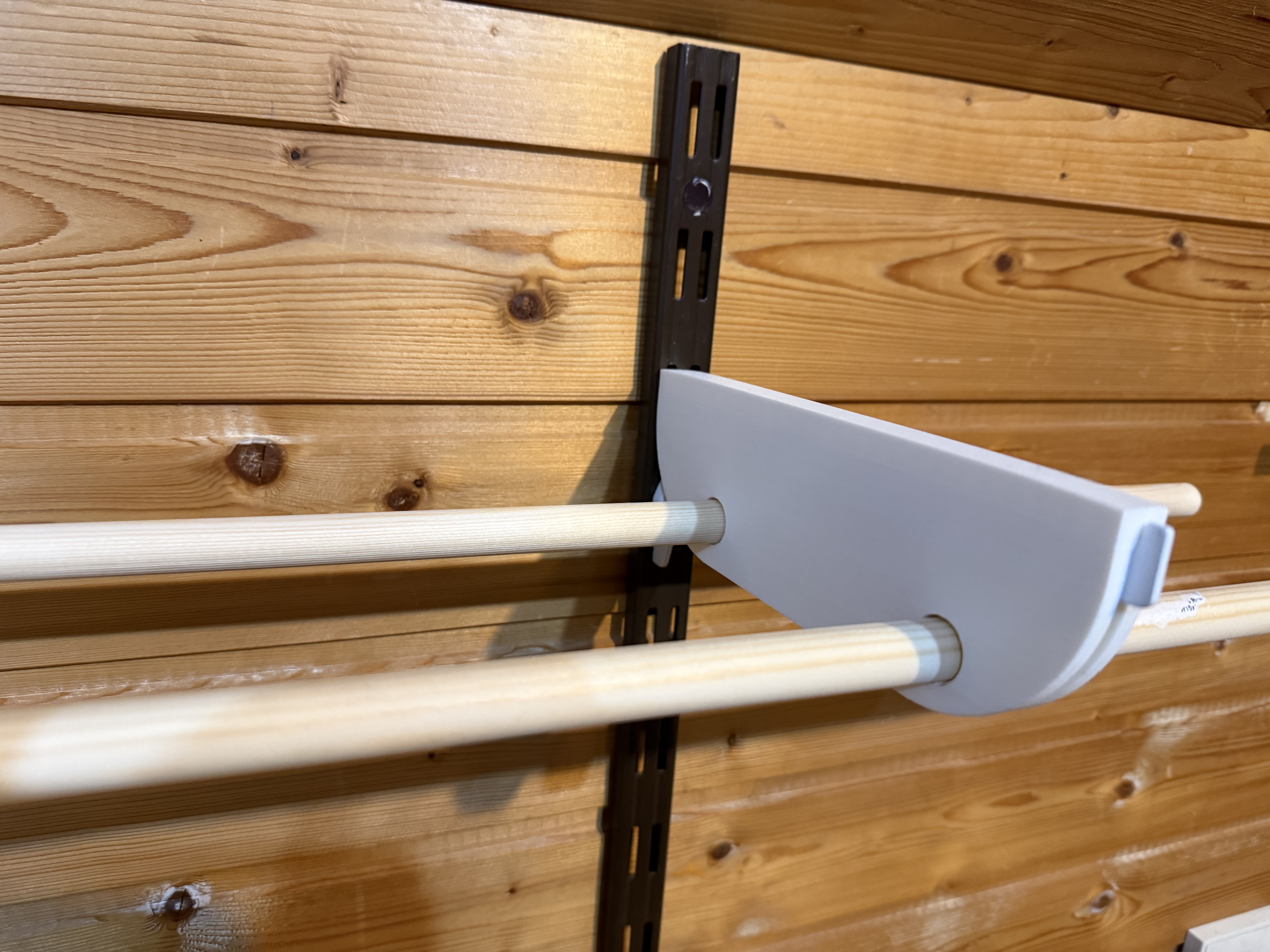Nhà mình vẫn còn dùng một hệ kệ cũ (thật ra giờ vẫn còn bán) làm từ ray kim loại bắt vít lên tường và các tay đỡ (ví dụ 20cm) bằng kim loại có thể móc vào nhiều vị trí khác nhau. Nhờ vậy có thể dựng hệ kệ rất linh hoạt. Với mẫu 3D này, các tay đỡ kim loại có thể được “chuyển đổi” thành giá đỡ cho 2 thanh rod, rất hợp để cất/treo cuộn filament. In rất nhanh.