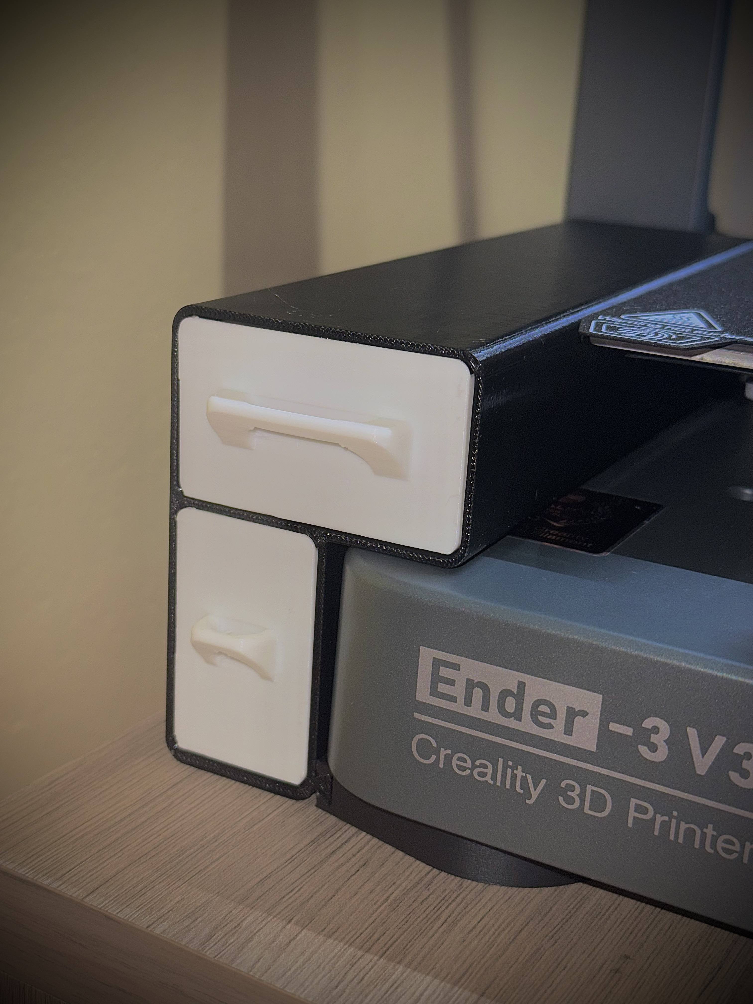 Bộ hộp bên trái kèm 2 ngăn kéo cho CREALITY ENDER 3 V3 PLUS, giúp tăng chỗ lưu trữ đồ thiết yếu. Thiết kế trượt vào FOOT_CLIP ở chân trước trái; khuyến nghị PLA cho drawers và PETG cho box/clip.