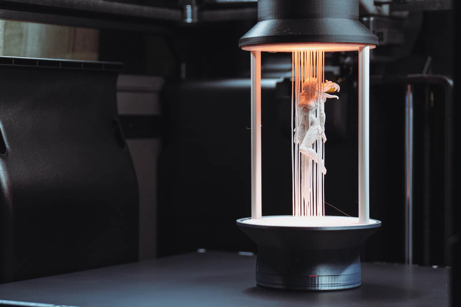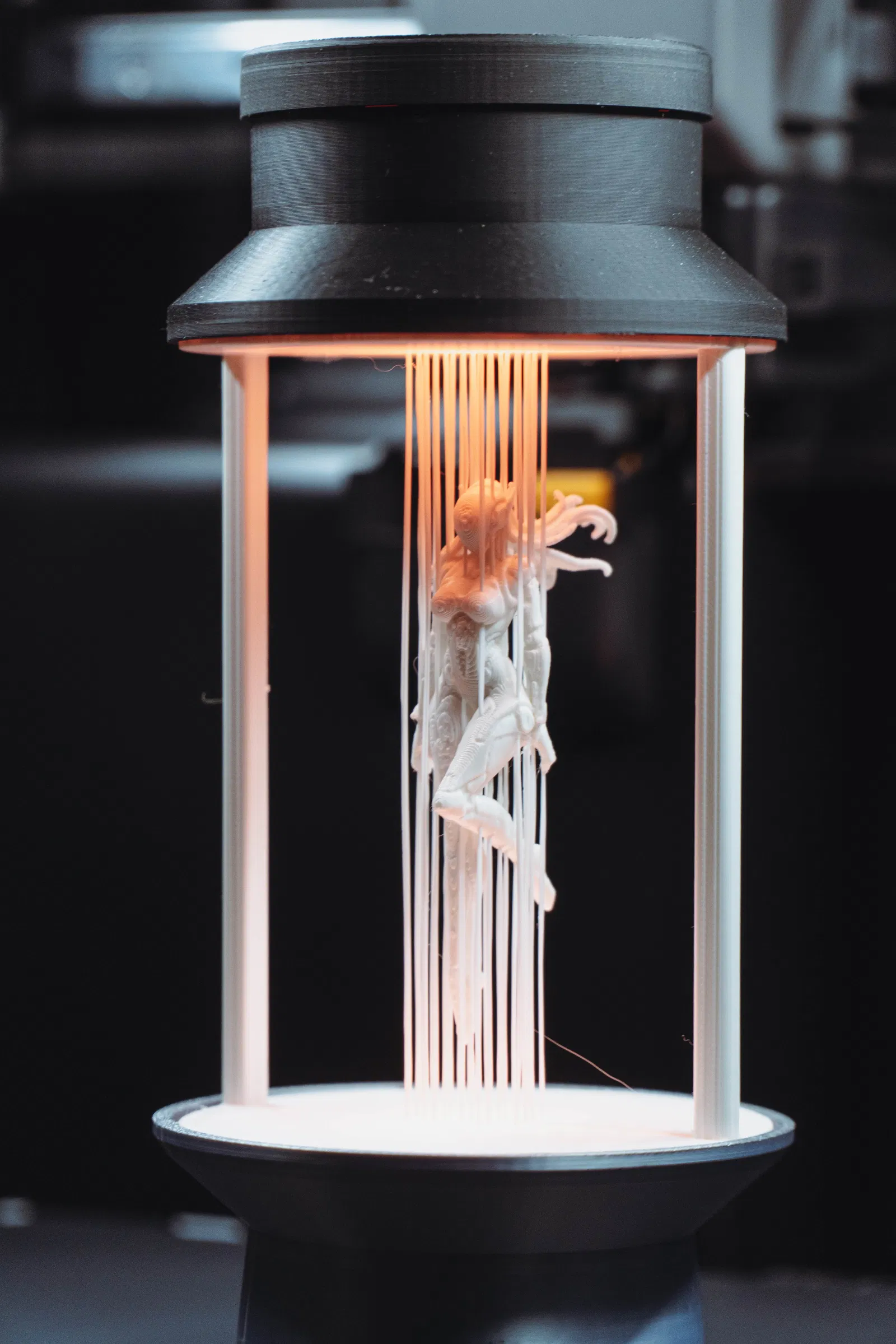 Hạn chế dùng Super Tack plate, vì lúc gỡ bản in ra có thể làm hư các “strings”. In xong thì ĐỂ NÓ NGUỘI! Nếu cố kéo ra lúc còn nóng, mấy sợi sẽ bị cong. Với mẫu này càng đúng nữa vì phần thân rất mỏng và dễ vỡ; đợi plate nguội thì bản in sẽ tự bong ra, không vấn đề gì.
