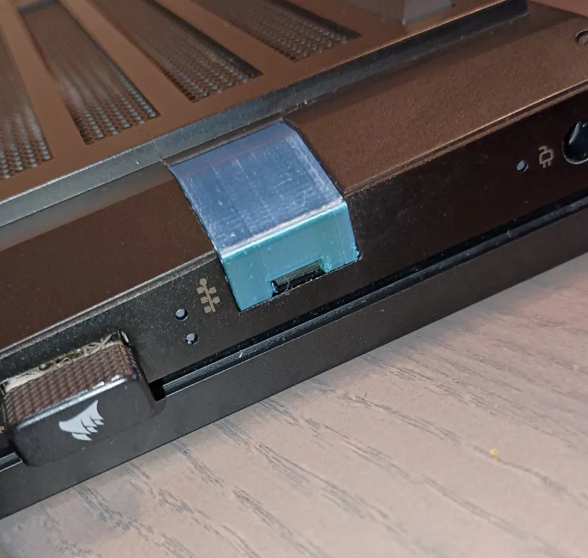 Miếng cover này sẽ che kín hoàn toàn cổng ethernet. Mình làm cái này vì miếng nhựa che cổng ethernet zin của HP Omen hay bị gãy rớt, làm các chi tiết kim loại của cổng bị mắc vào quần áo và các dây cáp khác. Mình không xài dây ethernet trên laptop, nên mình không cố tái tạo phần zin có cơ chế bản lề để có thể bật cover ra và lộ cổng để dùng bình thường.