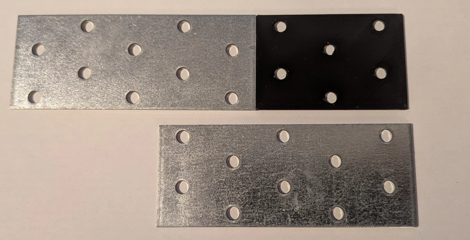 Bản nối phẳng 60x40mm theo kích thước DIN EN 14545, có 6 lỗ khoan lệch giúp hạn chế nứt gỗ khi bắt vít. Độ dày mặc định 1,8mm và có thể scale theo trục Z trong PrusaSlicer để tăng/giảm độ chịu lực.
