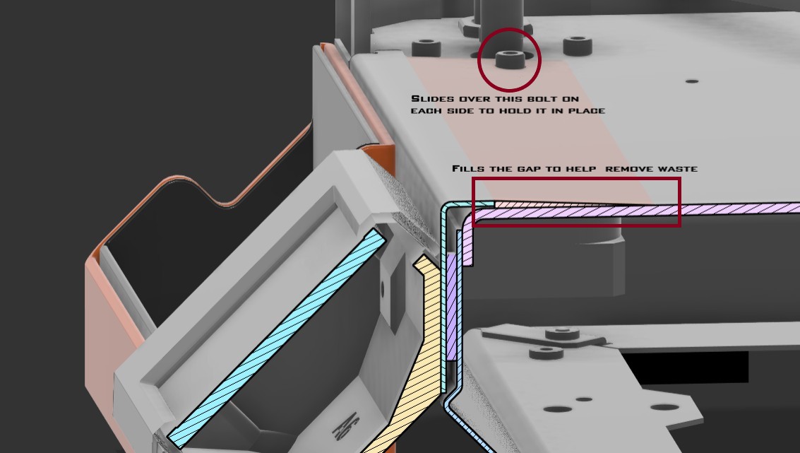 Ramp nhỏ để tránh rác/đầu thừa bị kẹt vào cái gờ ngay dưới cửa. Món này chỉ dày khoảng 1.4–1mm nên sẽ khá khó in. Nó trượt vào 2 con ốc để nằm đúng vị trí, không cần tháo ốc/bu-lông.
