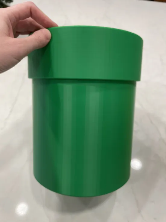 Thùng rác kiểu Ống Mario gồm 2 phần (đế và nắp) giúp giấu miệng túi rác kẹp giữa hai phần. Thiết kế tối đa để vừa khổ in Elegoo Centauri Carbon 256mm^3; dùng túi rác 4 gallon và có thể gập lại cho ôm khít.