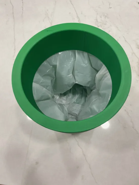 Mẫu gồm 2 phần: đế và nắp trên. Phần nắp có rãnh để chụp vừa lên phần đế và che phần miệng túi rác. Mình dùng túi rác 4 gallon, hơi rộng so với phần đế, nhưng có thể gập/ cuộn túi lại vào chính nó; cách này cũng giúp phần nắp ôm khít hơn.