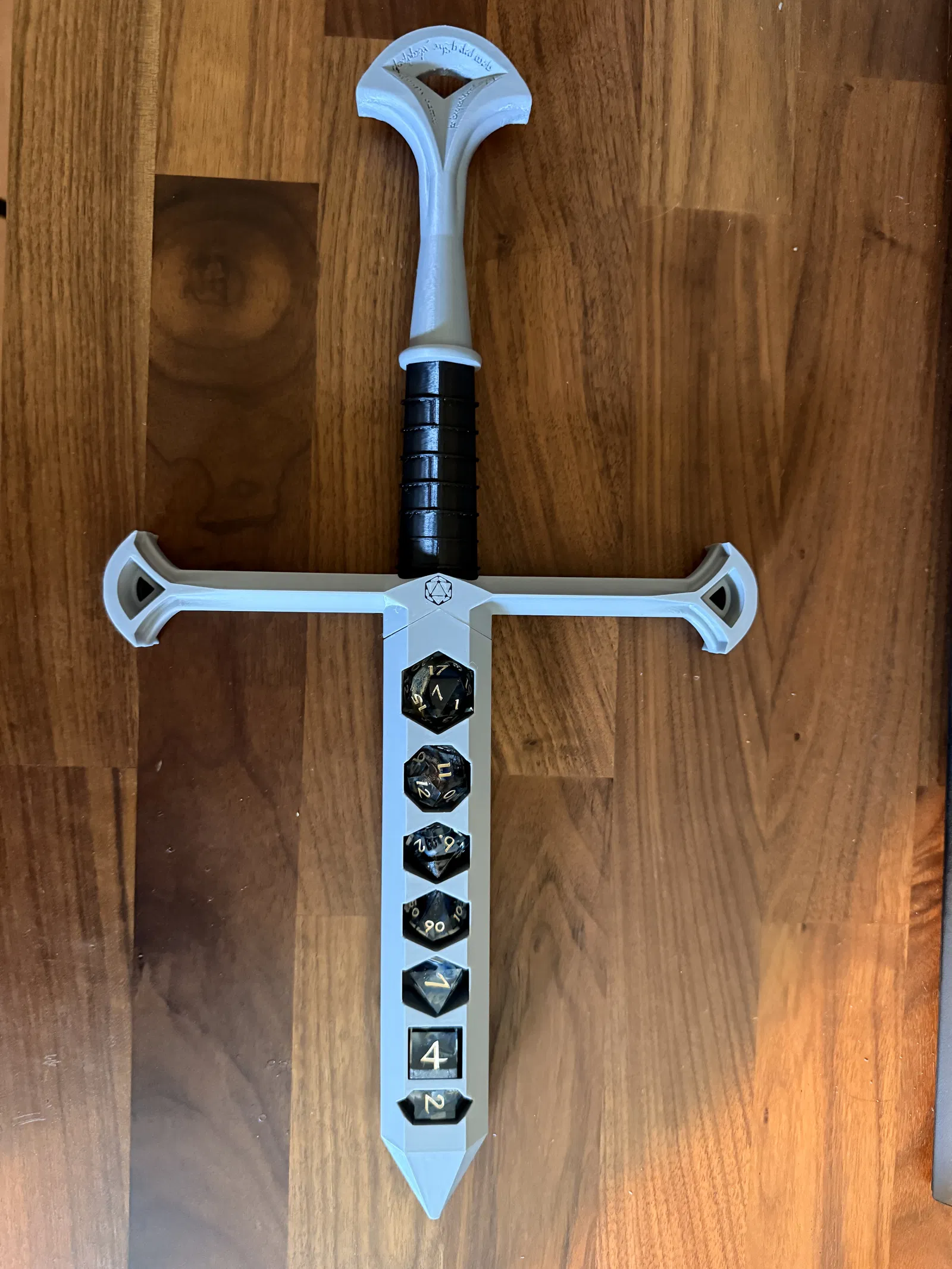Bản chỉnh sửa lưỡi dao/khay đựng dice kiểu Anduril/Narsil, tối ưu để vừa bộ dice khác: D20 kích thước lớn hơn và D4 dạng tinh thể. Phù hợp cho DnD/RPG, dice dagger/dice holder.