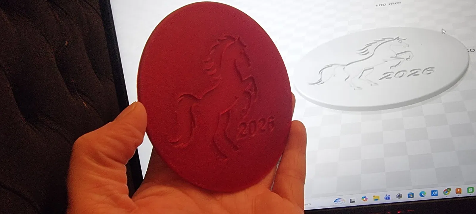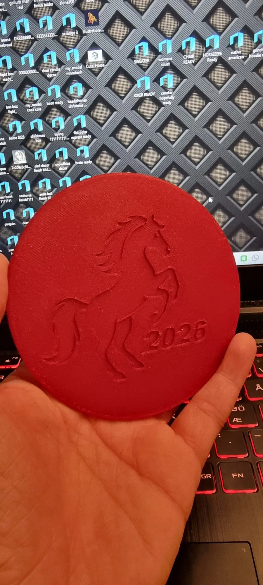 Đế lót ly thủy tinh Ngựa 2026 với hình ngựa chồm dập nổi. In ở layer height 0.08 mm, outer brim 5 mm, không cần supports. Kích thước đường kính 102 mm, dày 3 mm.