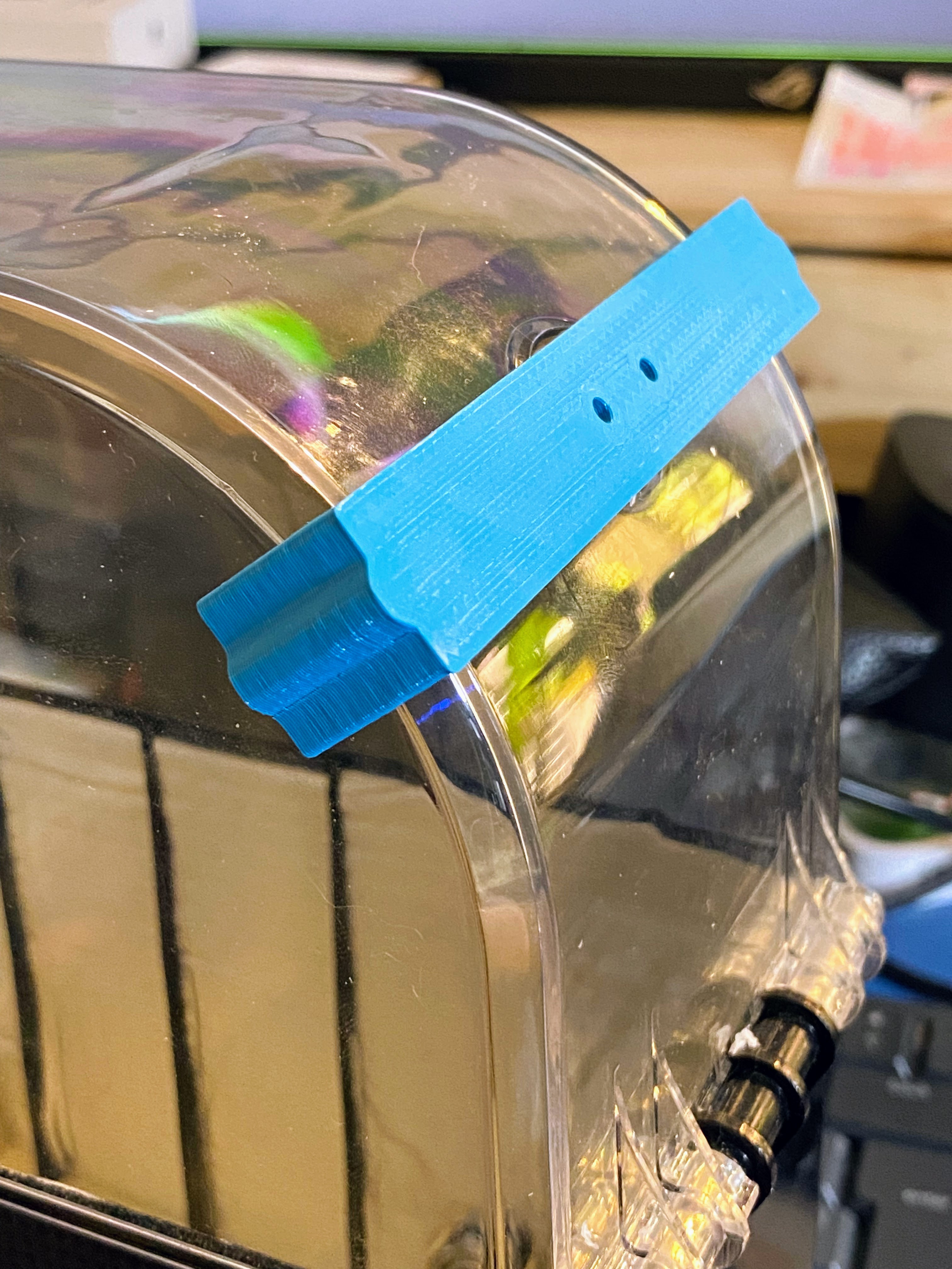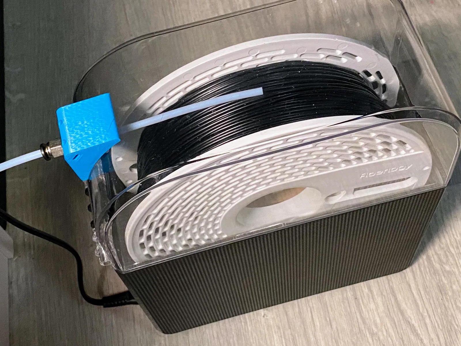 Vậy nên có một cách xử lý đơn giản. Cổng filament rộng khoảng 8mm, trong khi ống PTFE là 4mm. Cái adapter này cho phép bạn gắn ống song song với mặt trên của dry box, giúp đường đi mượt, giảm ma sát. Xem hình là hiểu rõ hơn.