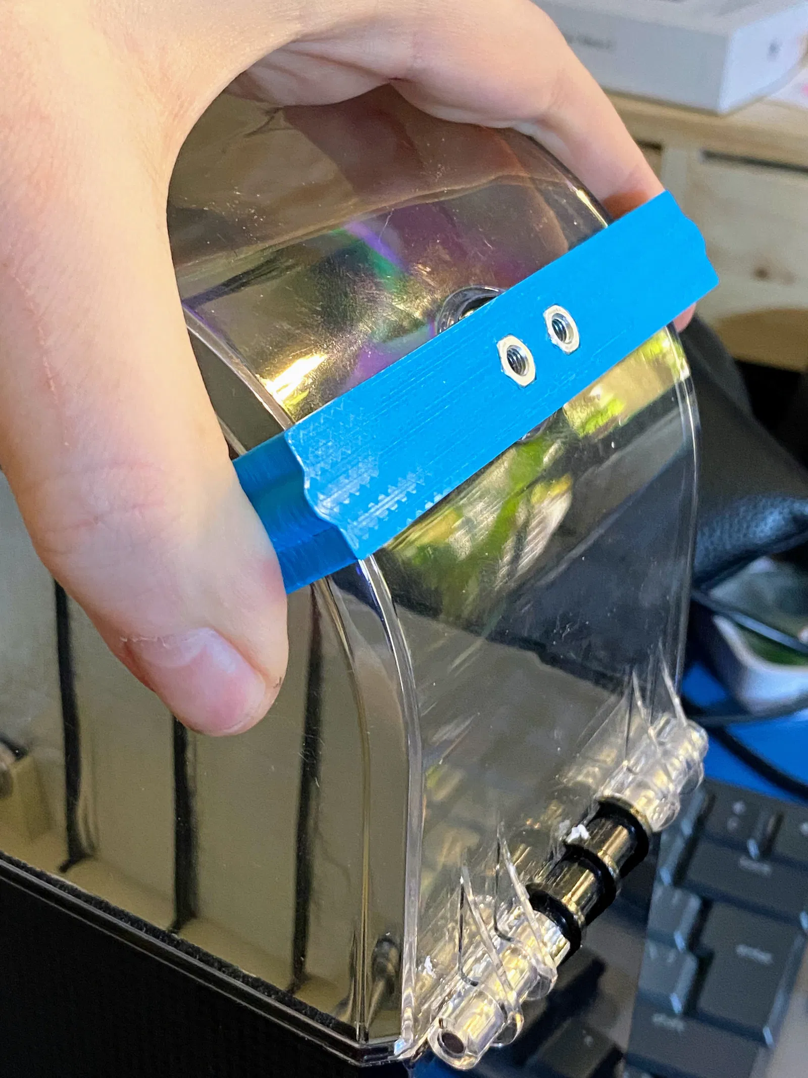- nhét 2 con ê-cu vuông M3 (kiểu Prusa) vào chi tiết đã in