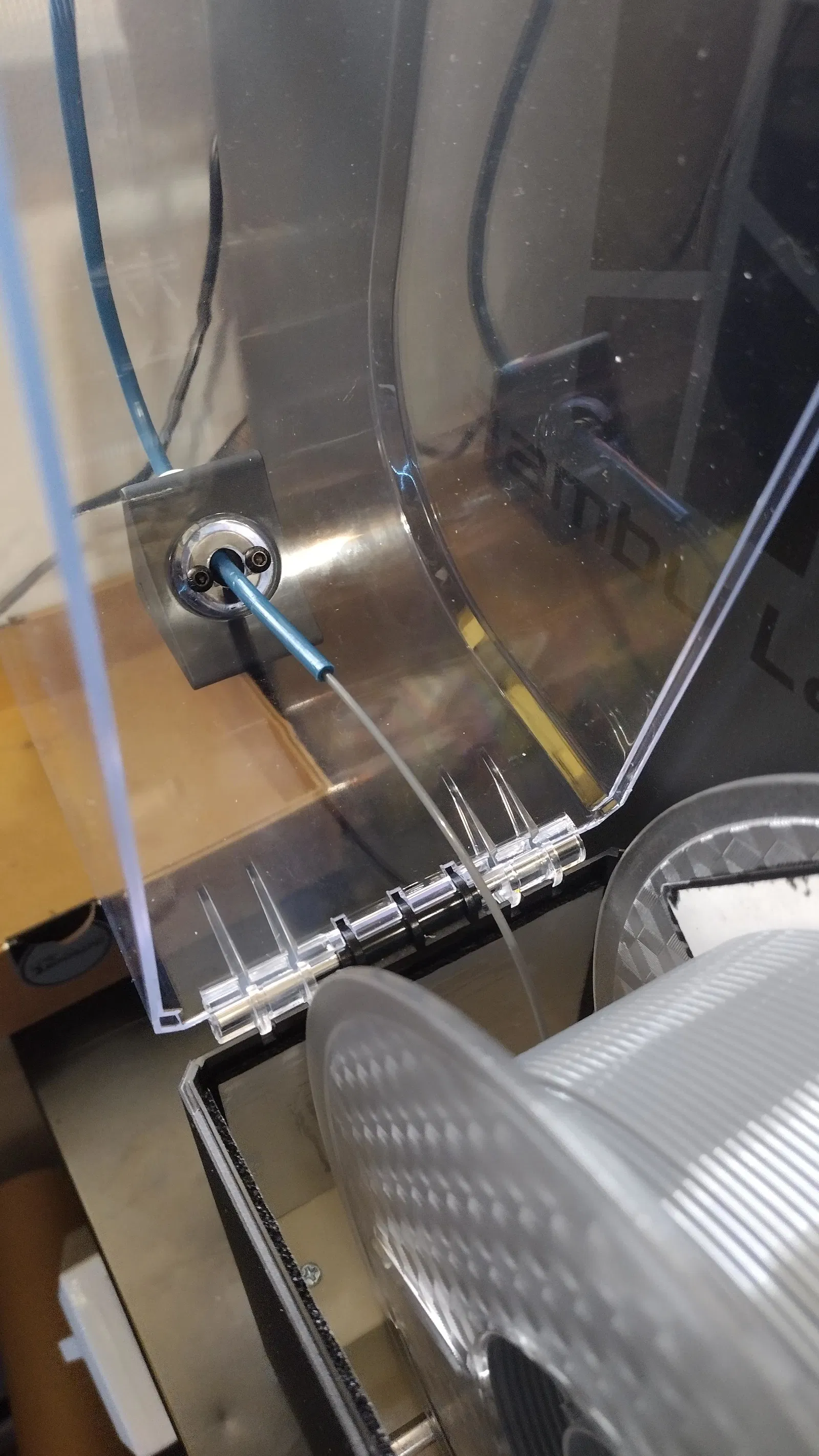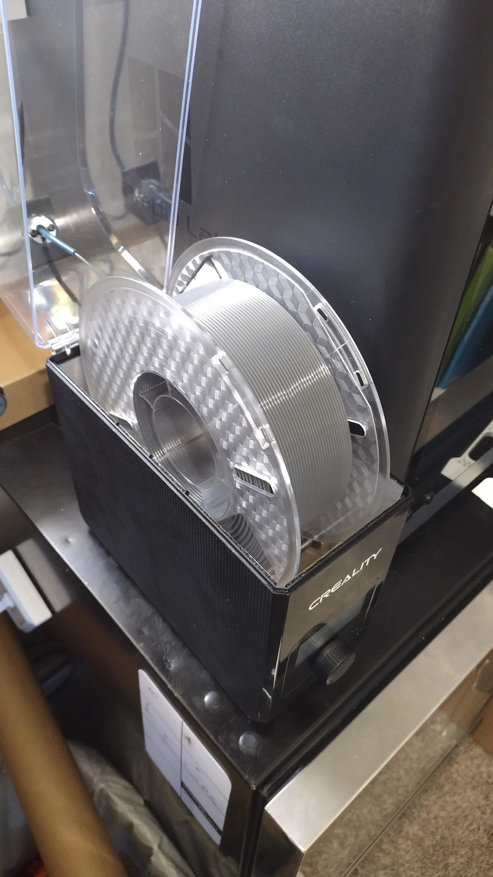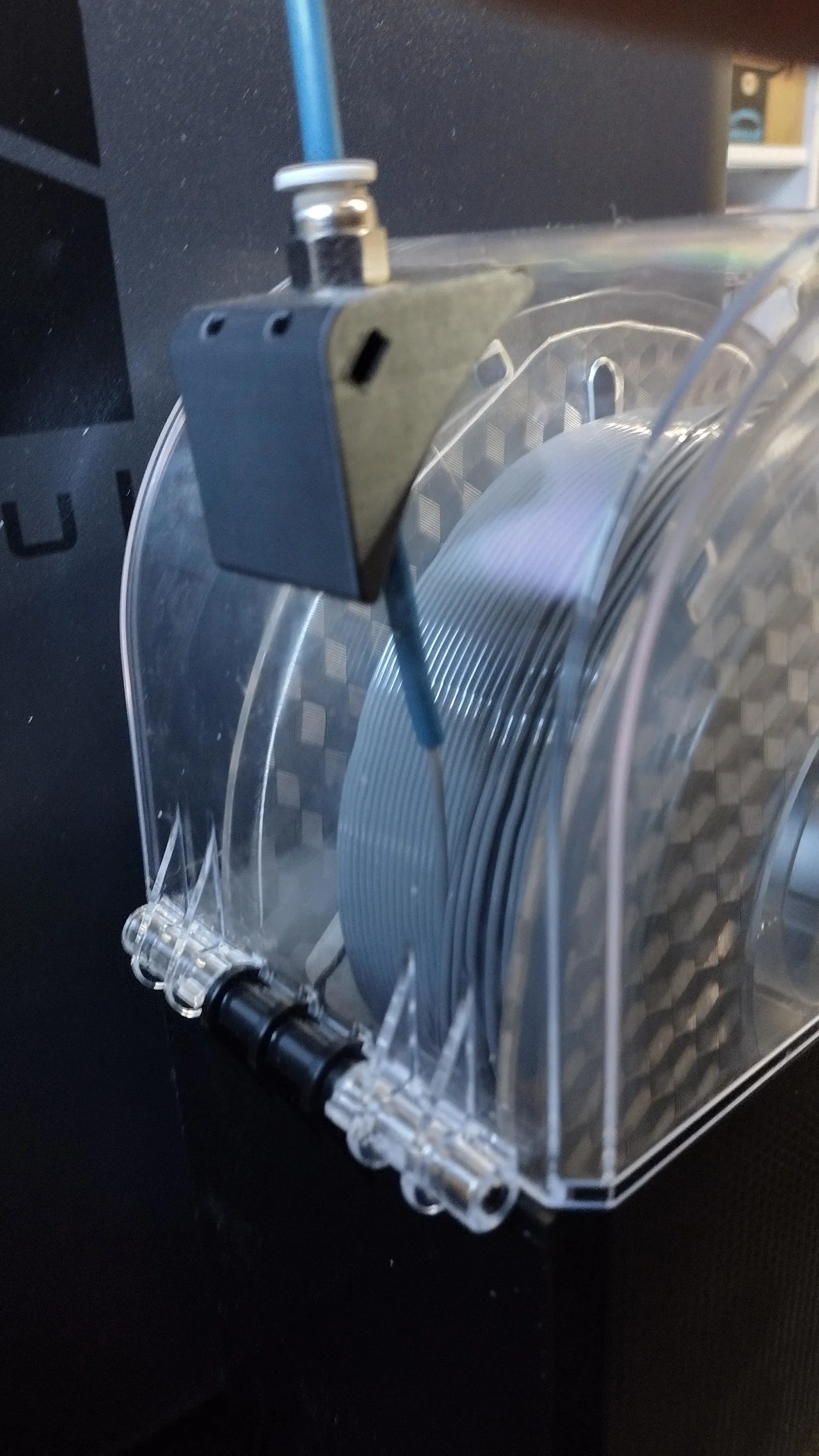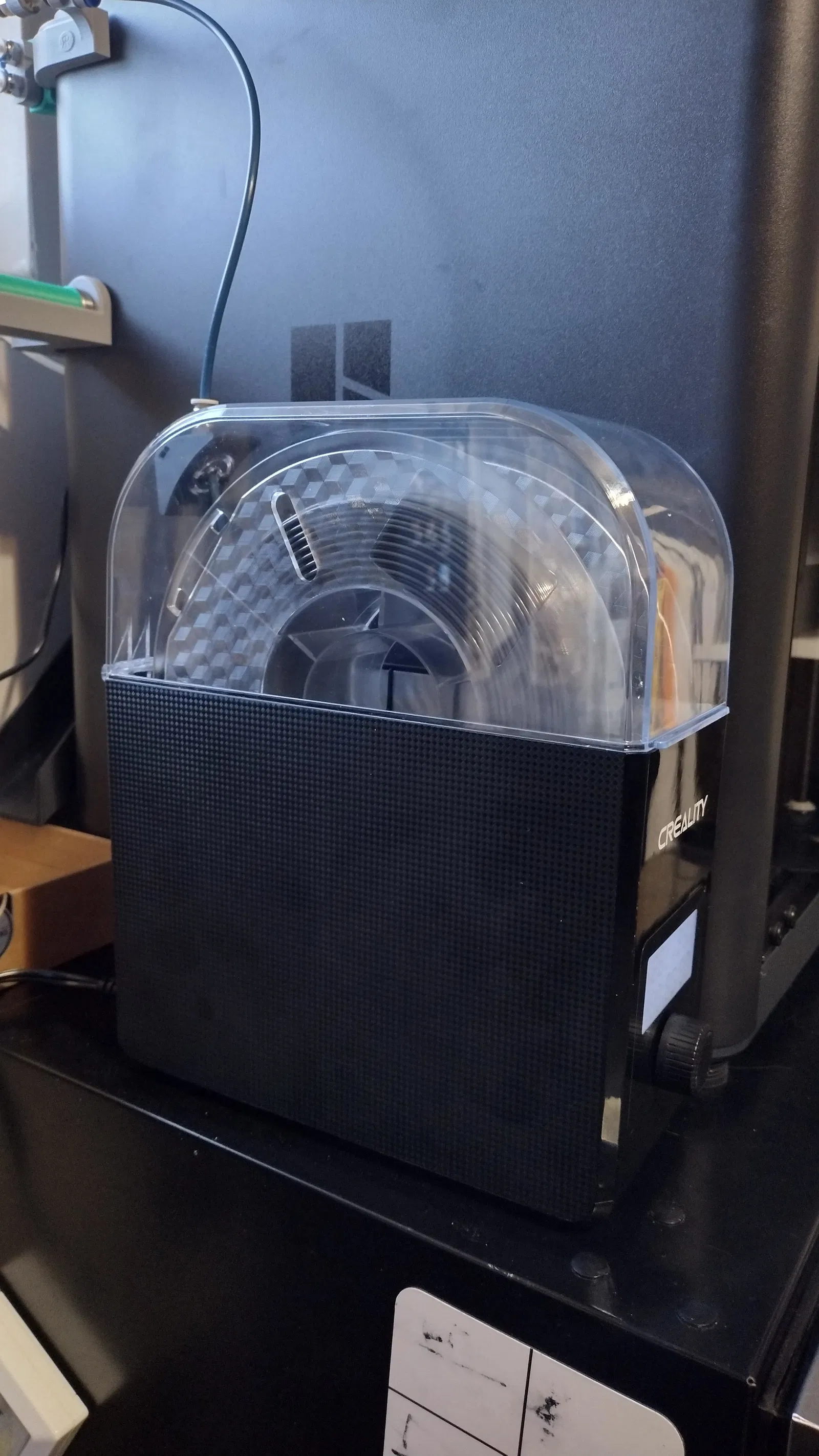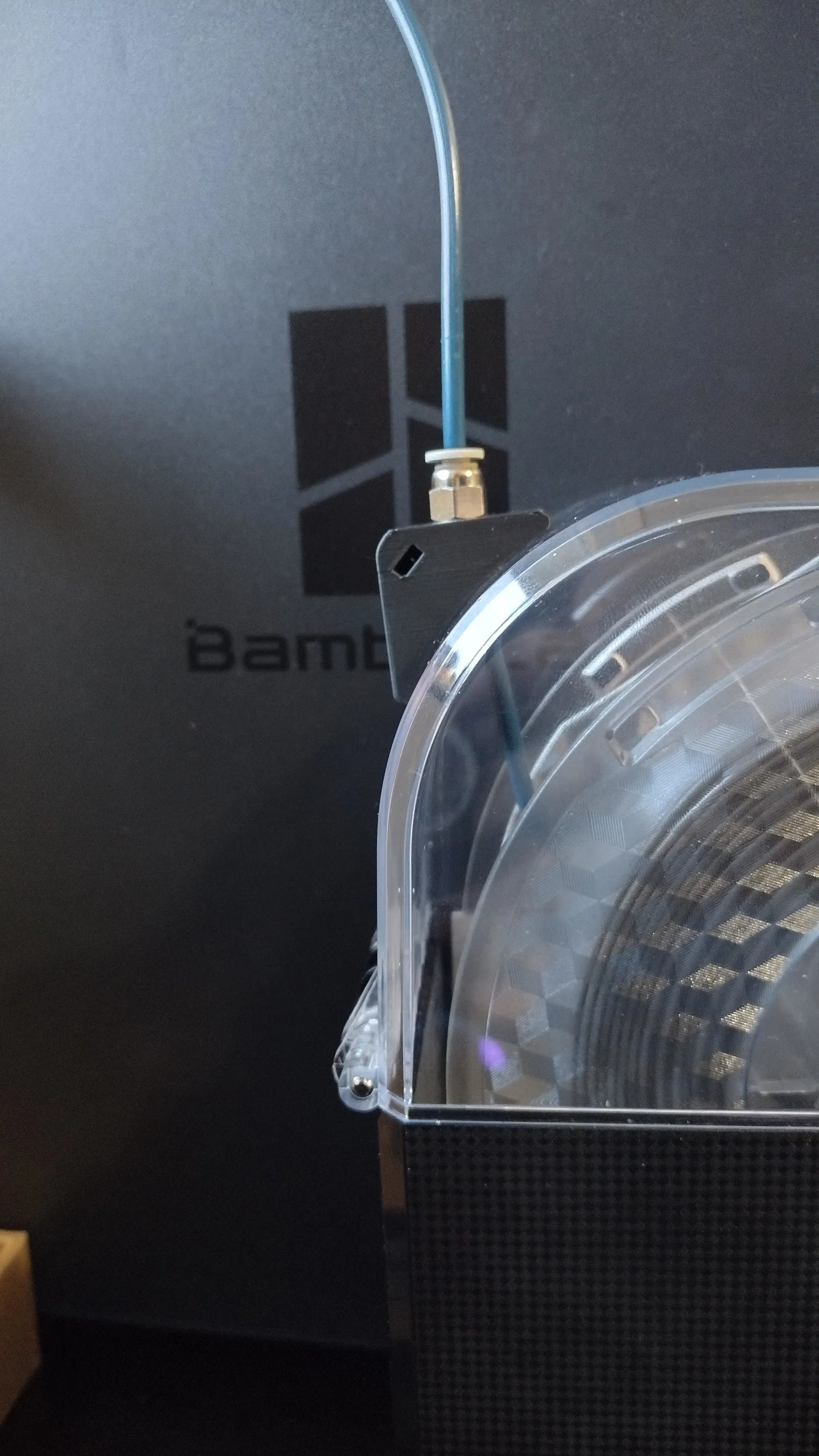 Mình mua Creality Dry Box 2.0 để giữ TPU khô khi in với P1S. Trên nắp hộp có một lỗ nhỏ phía sau để filament đi ra, tuy nhiên lỗ này lại cho PTFE đi ra theo hướng vuông góc với cuộn filament chứ không theo tiếp tuyến. Nhìn theo góc độ thiết kế kỹ thuật thì hộp sấy làm khá ổn, nhưng góc thoát của filament cần được chỉnh lại để hoạt động tốt hơn.