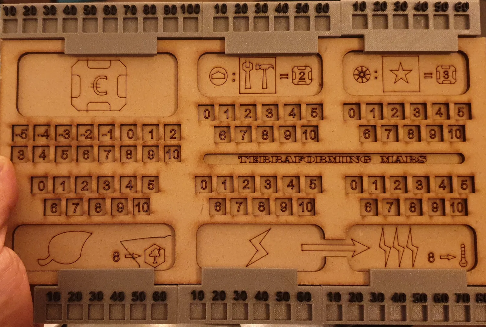 Miếng mở rộng production nhỏ dành cho player board bằng gỗ của Terraforming Mars, giúp không bị kẹt khi production vượt quá 10. Có thể tùy chỉnh lại để hợp với bộ board của bạn.