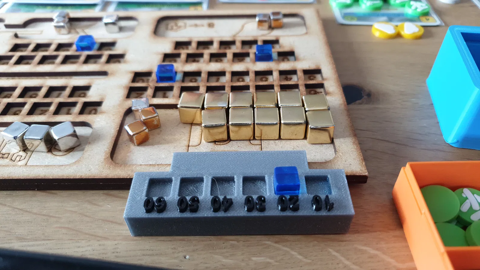 Vợ mình mua cho mình mấy player board bằng gỗ cho TM này từ vài năm trước. Nhưng có một chuyện lúc nào cũng làm mình thấy lấn cấn: tụi mình nhanh bị “kẹt” khi production vượt quá mức 10 (chuyện này hay xảy ra vì tụi mình thích kéo dài ván chơi). Vậy nên mình thiết kế mấy miếng extension nhỏ cho phần production này.