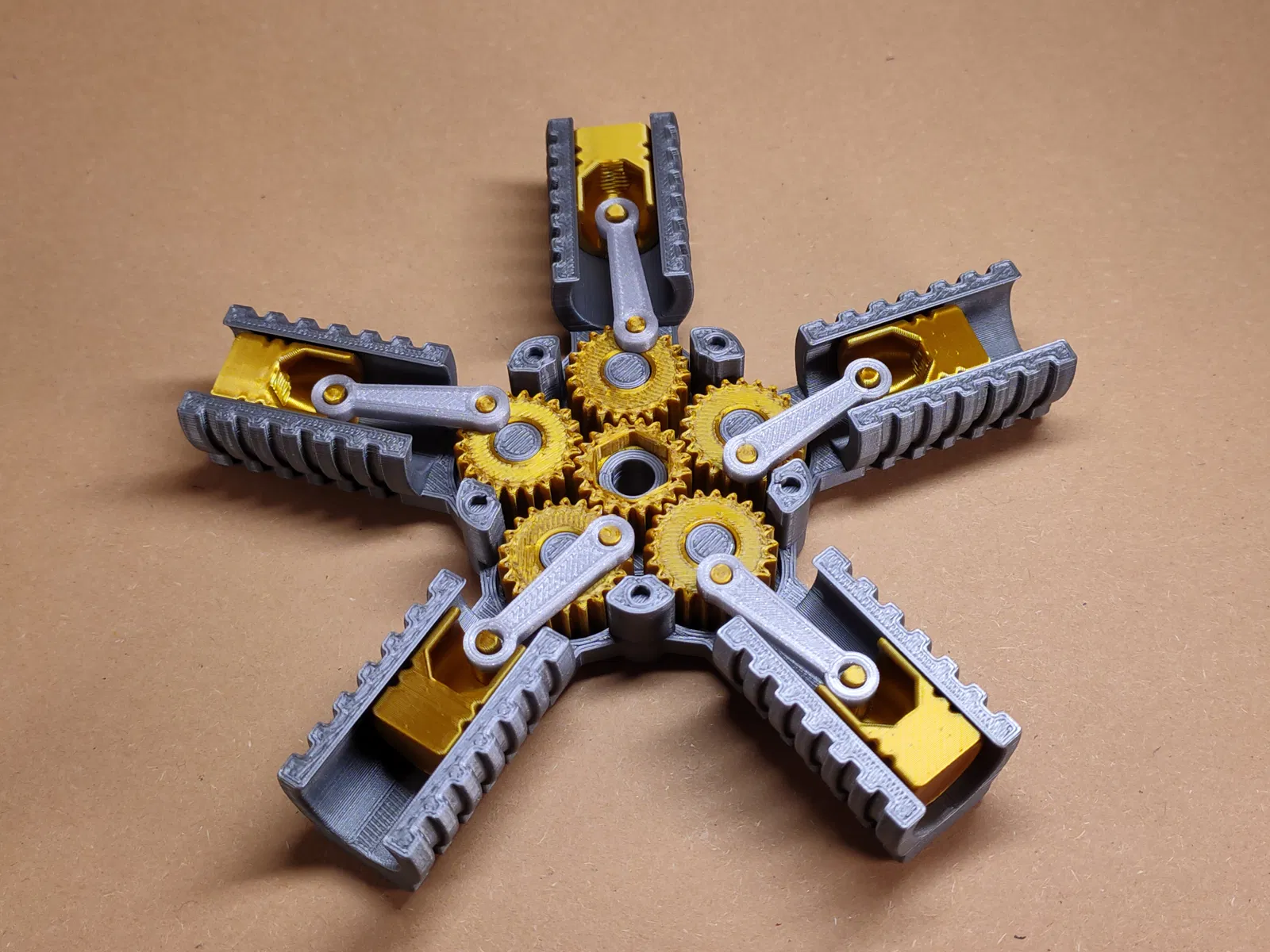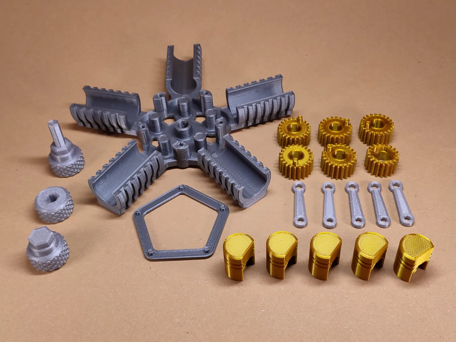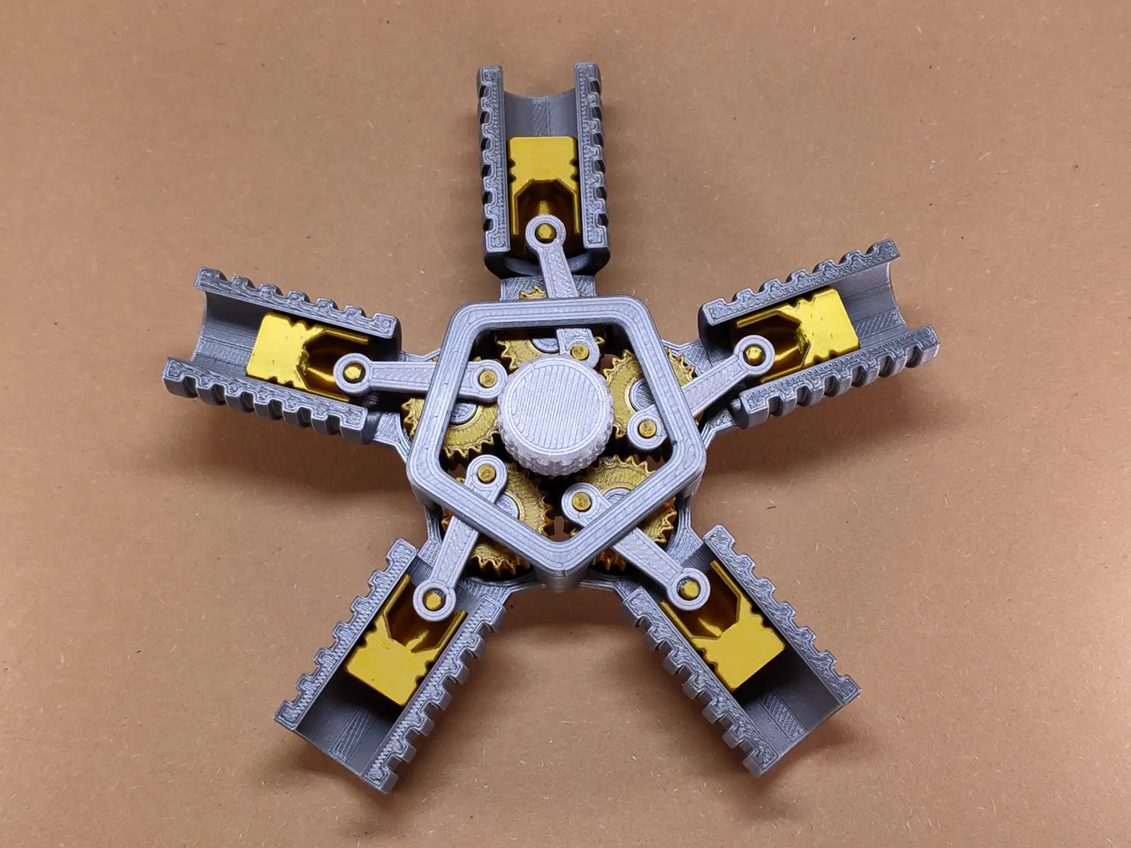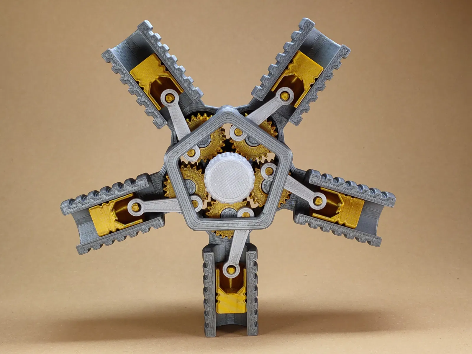 Engine Fidget 5 piston dành cho ai mê động cơ và bánh răng. Lắp ráp đơn giản: gắn gear trung tâm, gear ngoài, piston và rods, rồi lắp nắp vỏ. Muốn xoay từ phía sau thì gắn Knob A/B; nhớ làm sạch lỗ và seam để chạy mượt.
