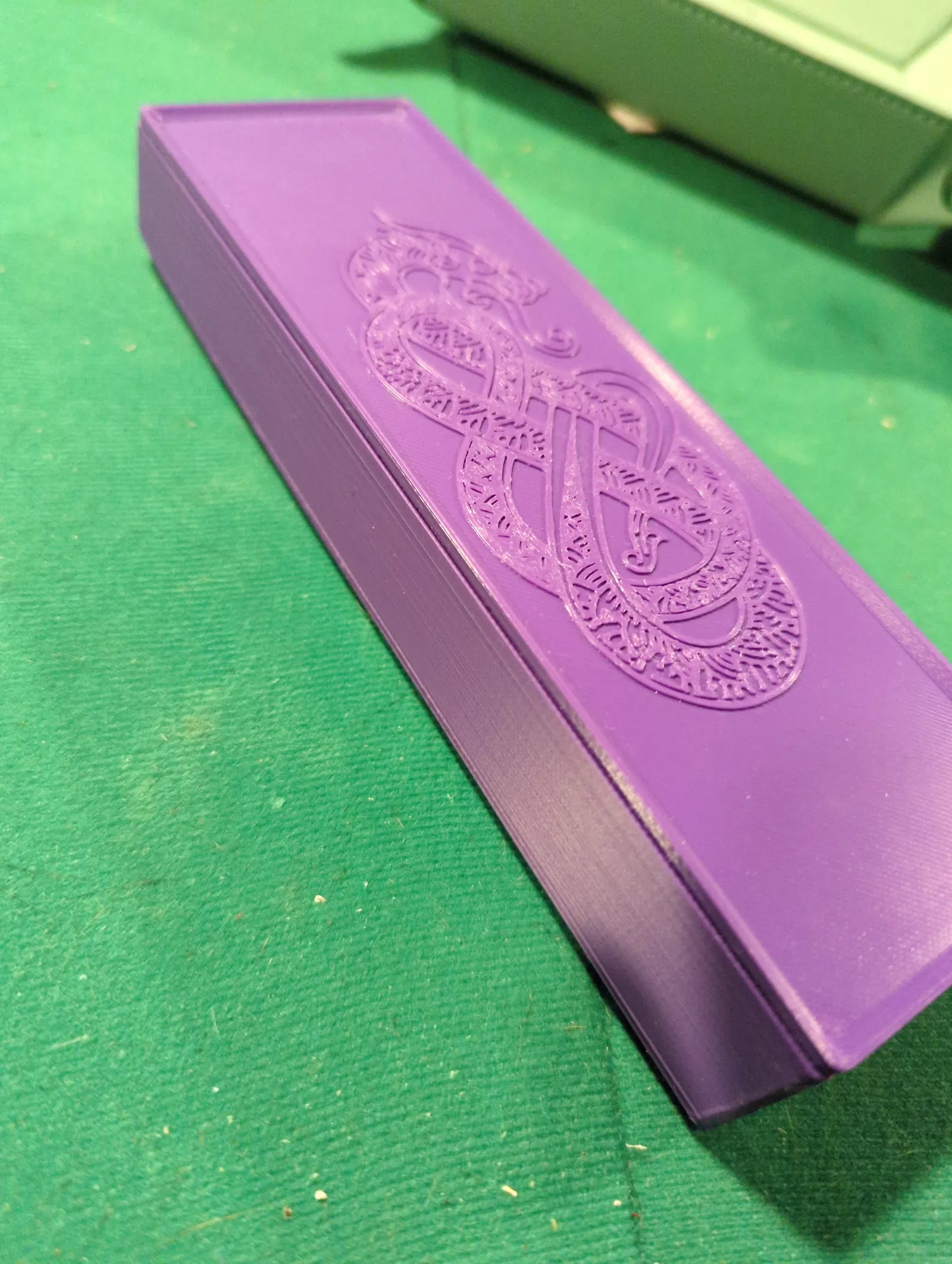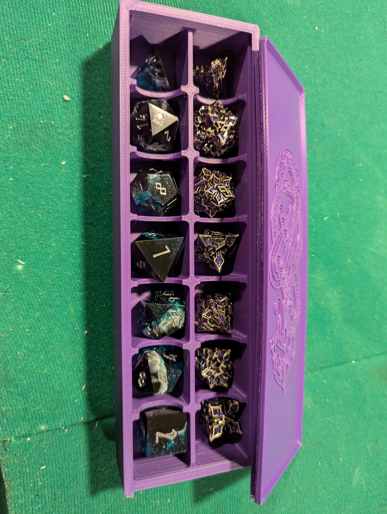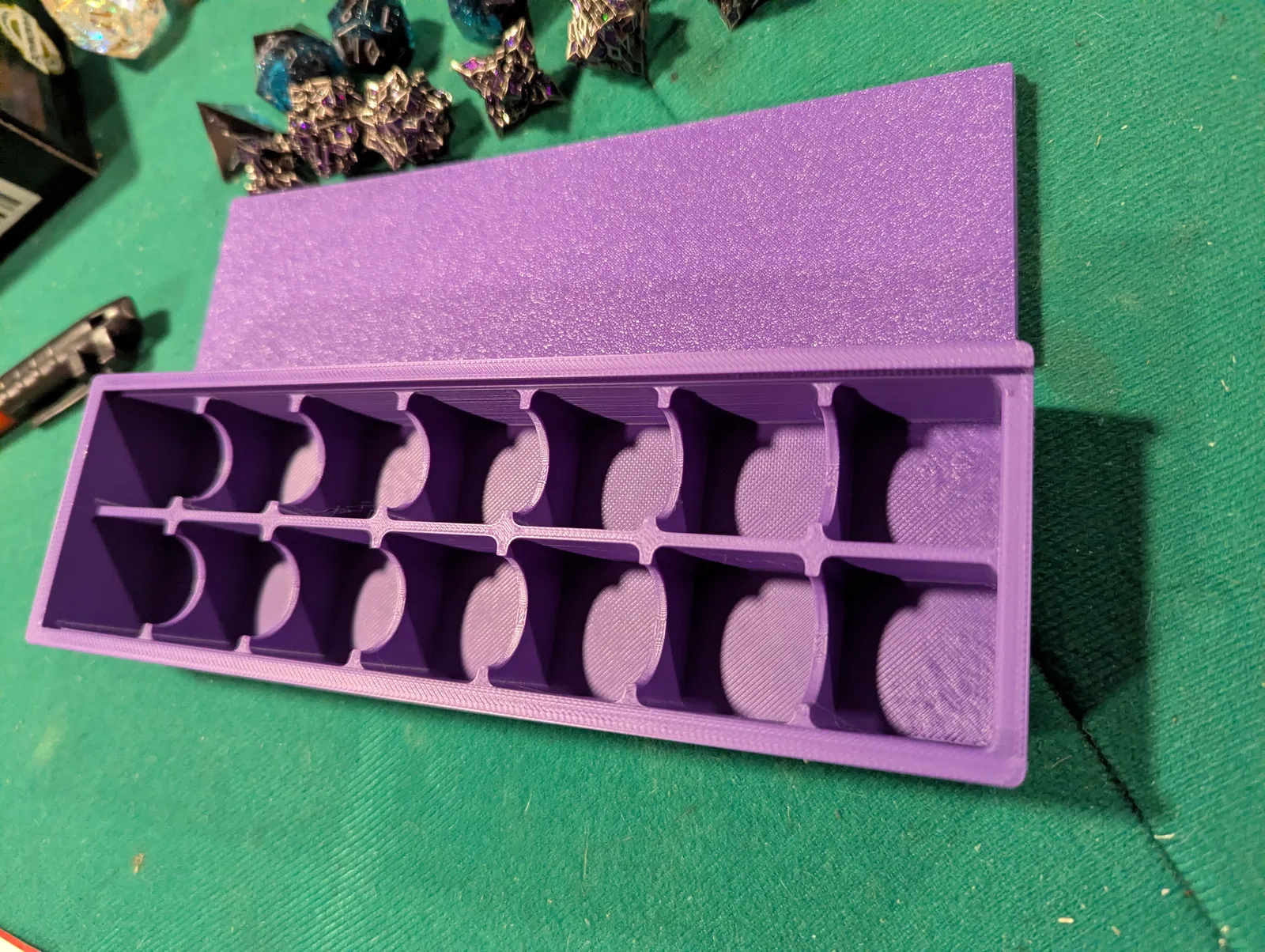 Bộ xúc xắc Emberglow bự hơn xúc xắc tiêu chuẩn. Mình làm một khay/box đựng dạng double set, với các ô vuông kích thước 25 mm x 25 mm x 25 mm. Có nắp trượt.