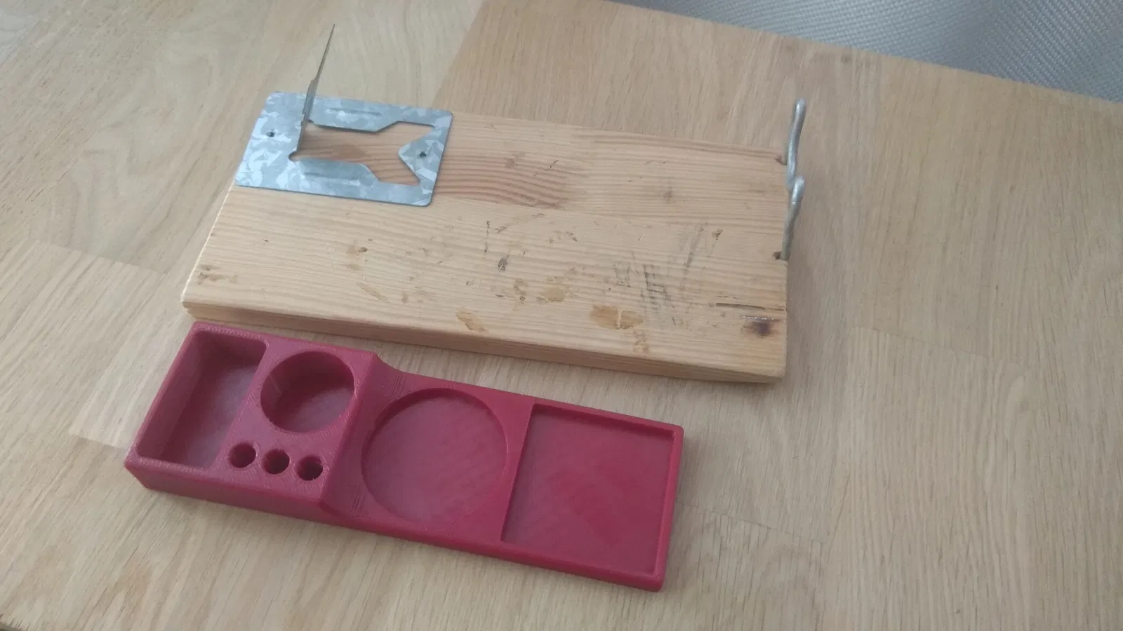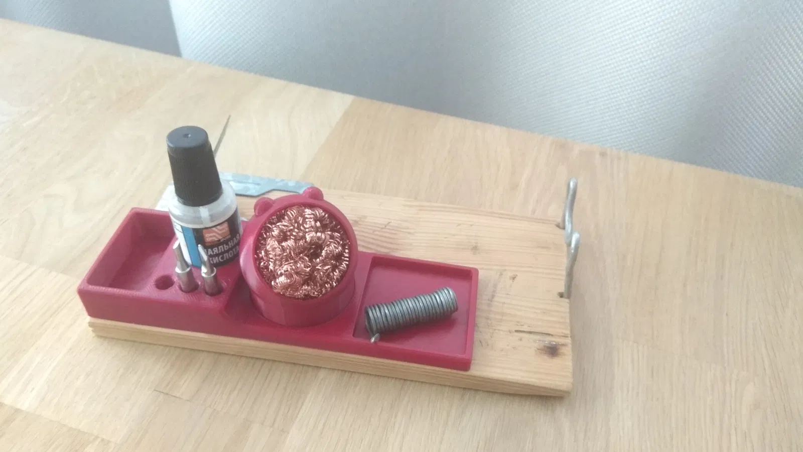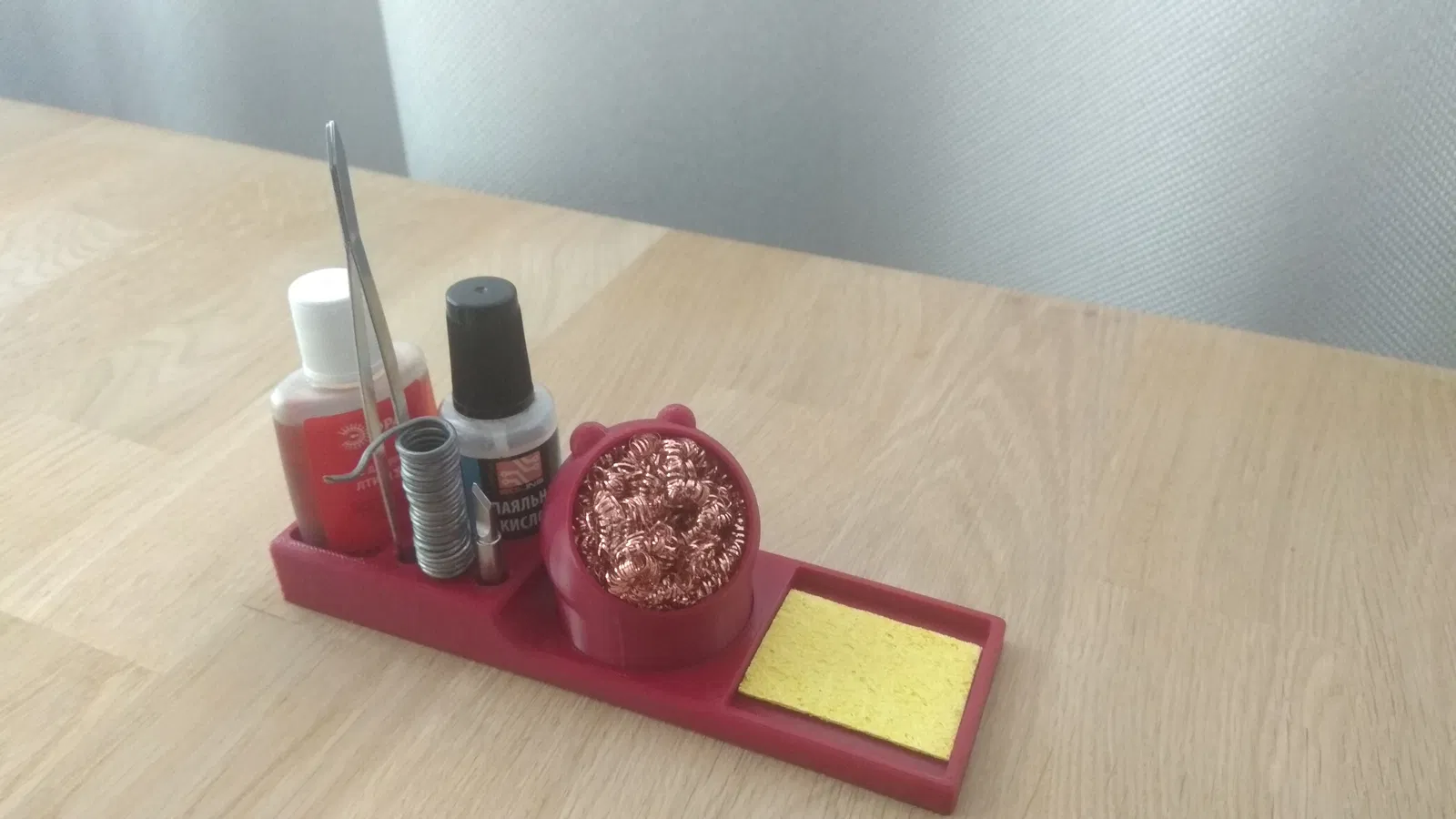 Mẫu này được thiết kế để dùng với cái giá đỡ mỏ hàn hiện có. Trên đó có thể để những món cần thiết cho lúc làm việc, và sau khi xong có thể lấy ra hoặc cất hết một lượt vào ngăn kéo. Ngoài ra mọi thứ nằm chung một chỗ nên rất tiện. Gắn bằng keo dán.