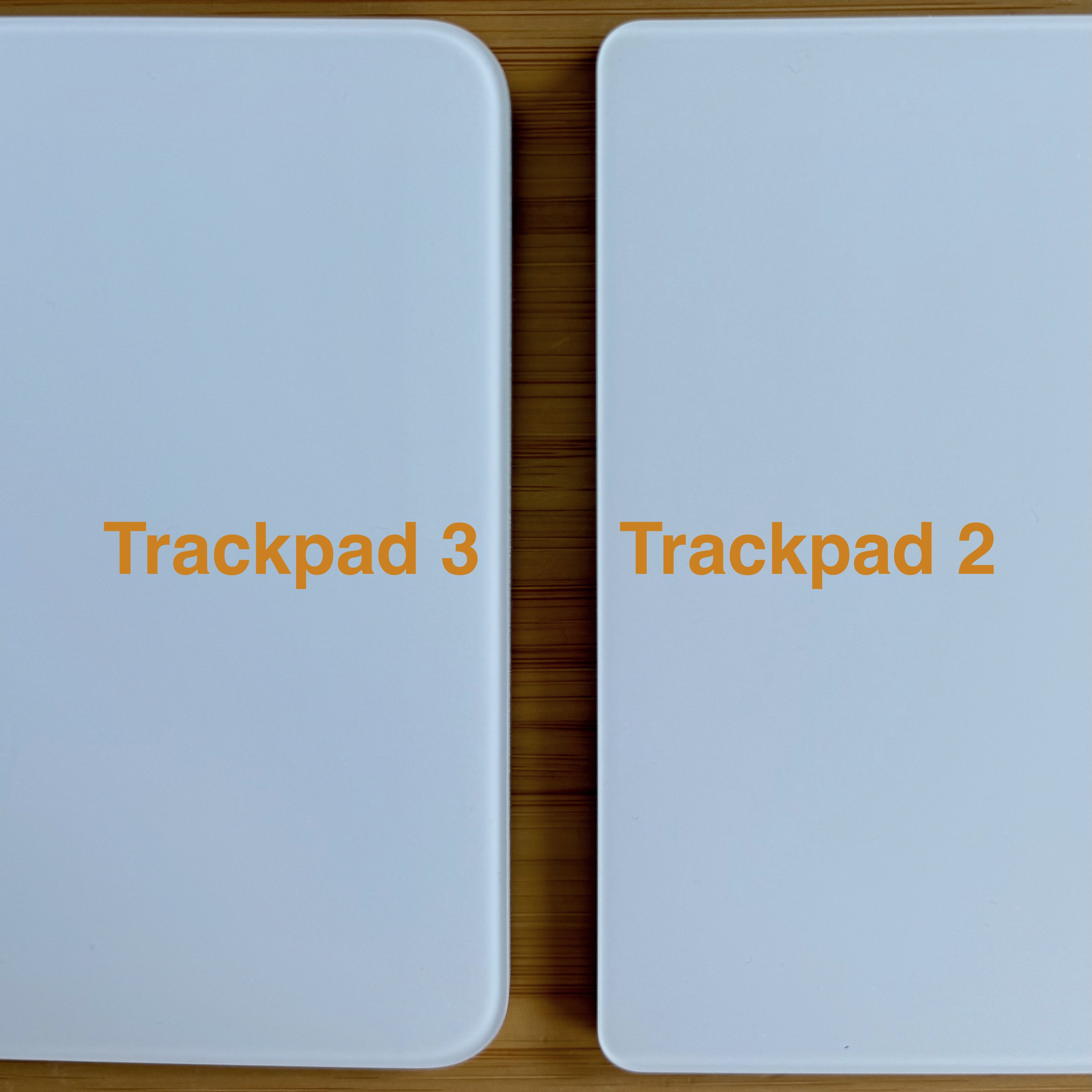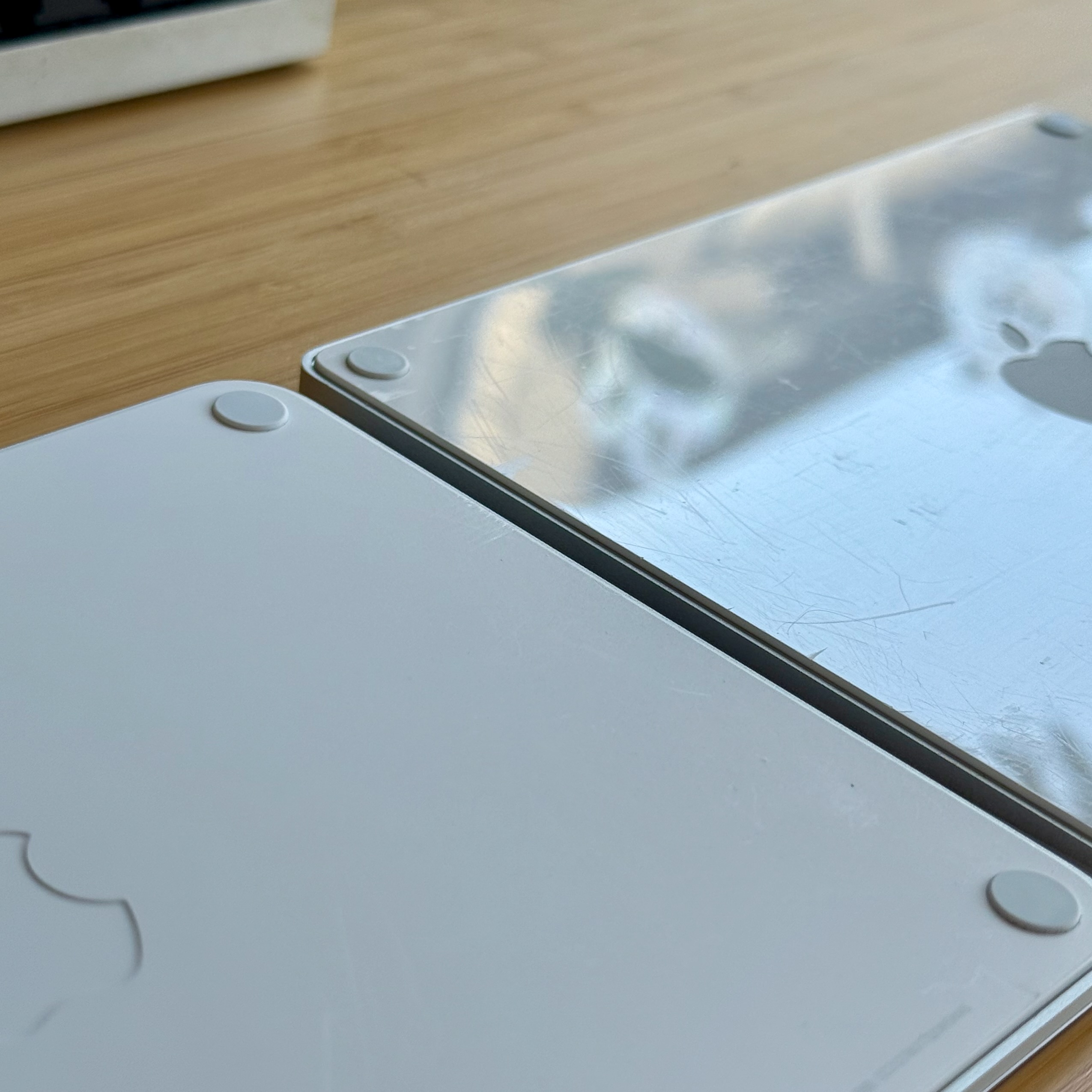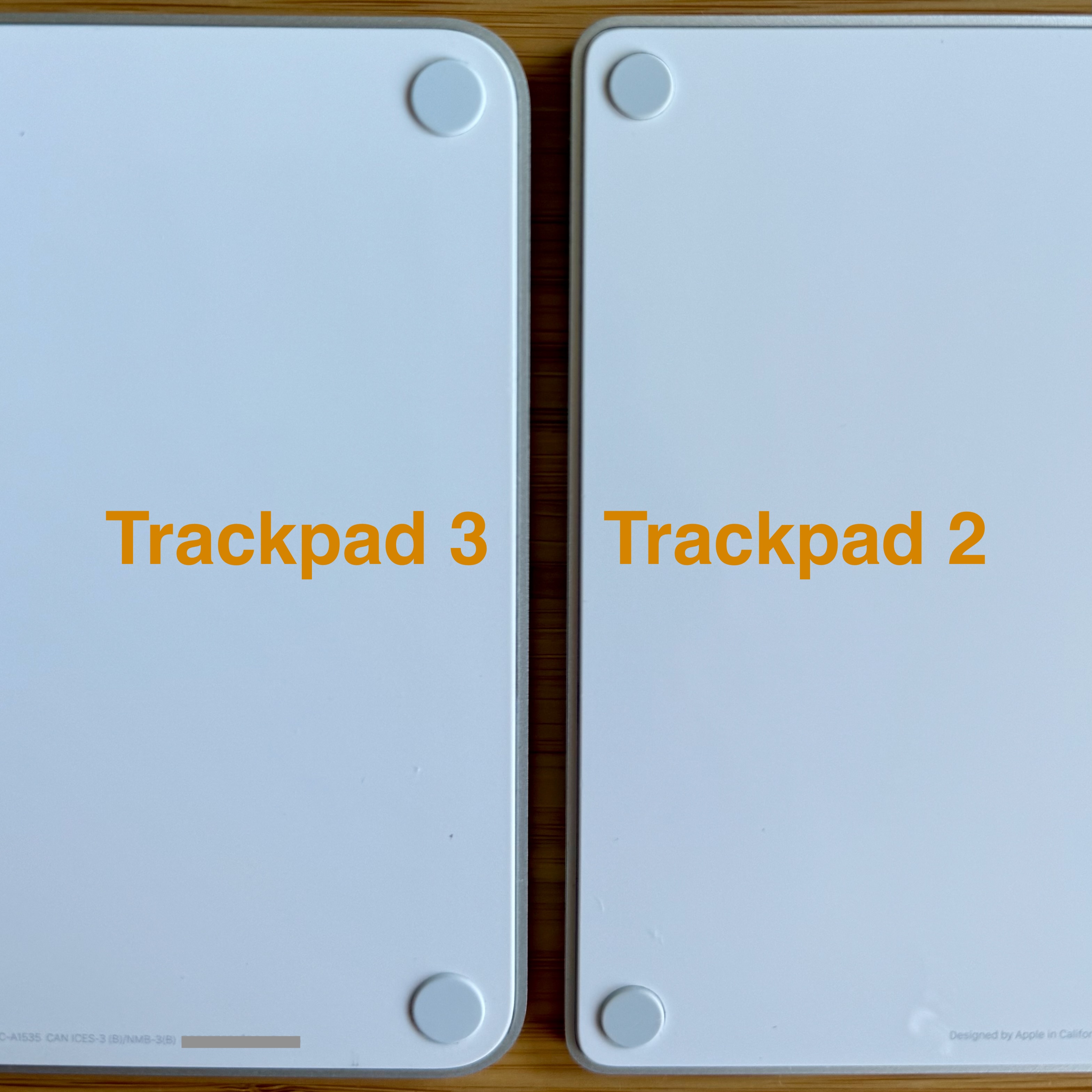 Trước hết, bạn cần xác định phiên bản Magic Trackpad của mình. Như trong ảnh, Trackpad 3 (ra mắt 2021) có bán kính bo (fillet radius) lớn hơn so với Trackpad 2. Điều này nhìn rõ hơn khi xem khoảng cách giữa cạnh thiết bị và các chân cao su. Ngoài ra, mặt đáy của Trackpad 2 mình có thì bóng, còn tấm đáy Trackpad 3 là dạng mờ (matte).