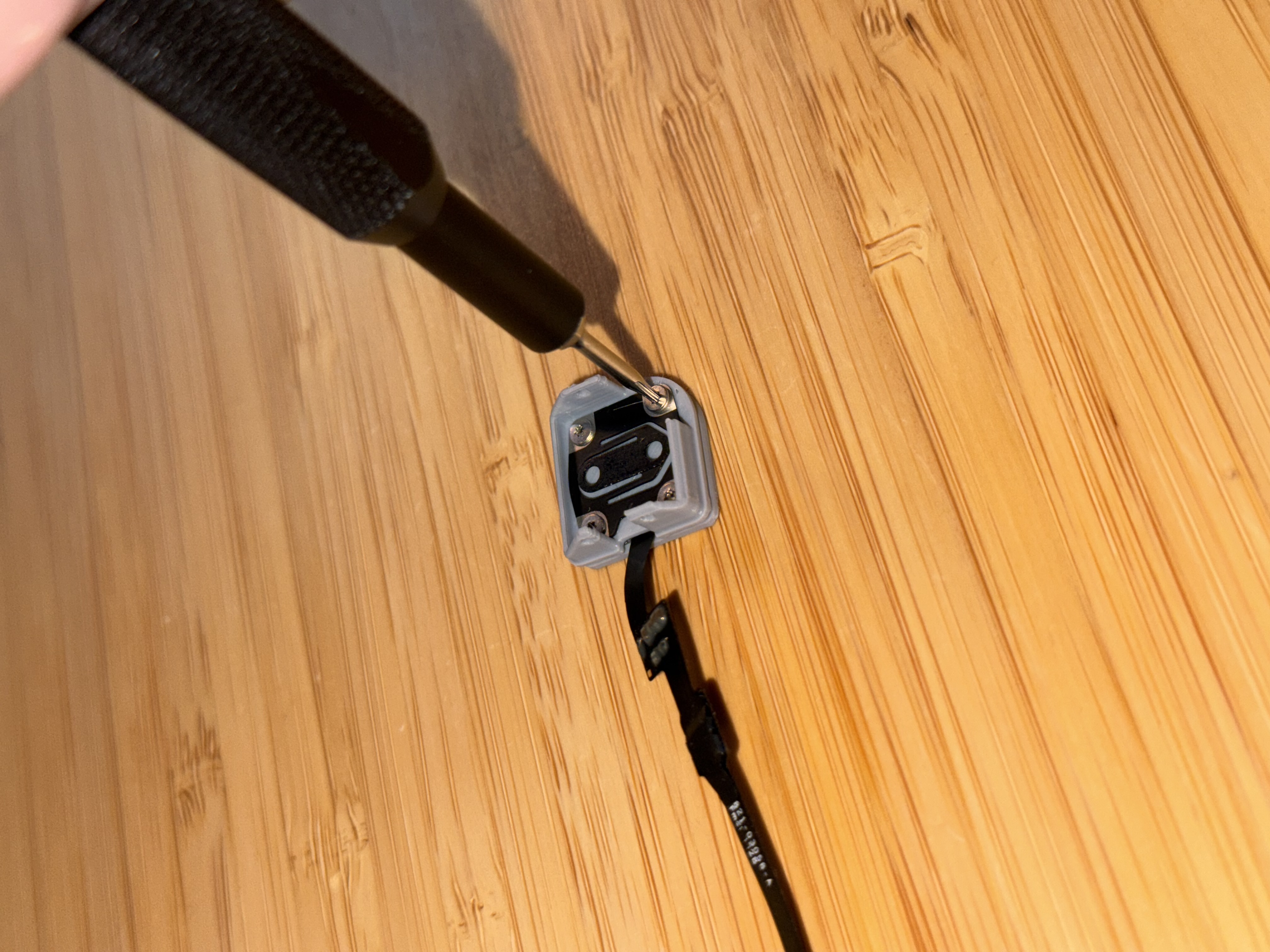5. Luồn cáp flex dài qua lỗ trên chỗ gắn sensor và canh hướng để lát nữa bẻ góc 90° được. Tránh xoắn riêng từng đầu của sợi cáp mỏng manh này