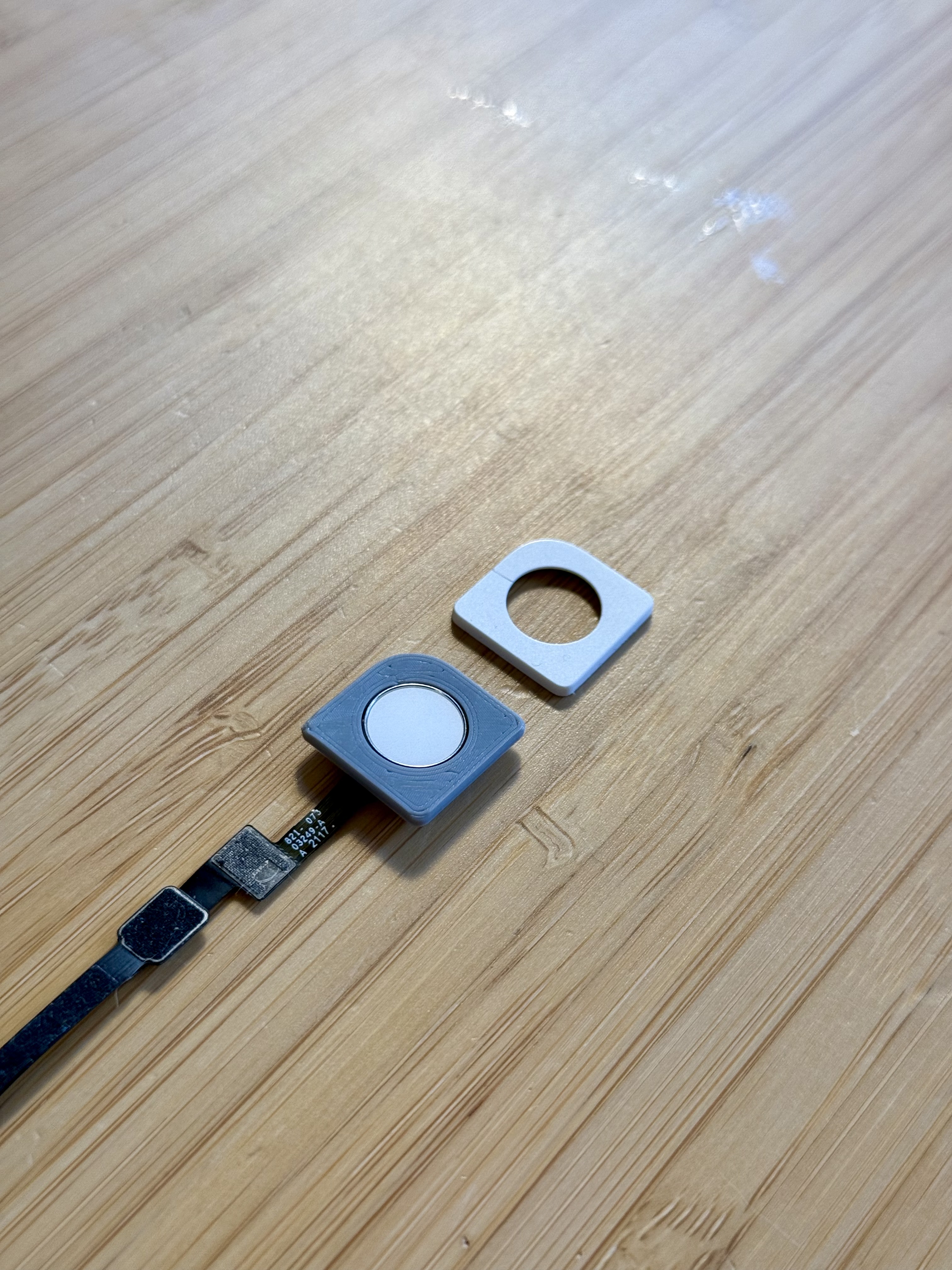 Touch ID cực kỳ tiện khi dùng macOS, nhưng lại bị giới hạn trên bàn phím Apple, mà mấy cái đó thì mình không khoái và cũng không muốn để trên bàn. Module Touch ID độc lập của SnazzyLabs đã truyền cảm hứng để mình làm cái tương tự, nhưng mình muốn tránh việc có thêm một cái “hộp” trên bàn. Vậy nên mình bắt đầu gắn nút Touch ID một cách liền lạc vào thứ lúc nào cũng có trên bàn: Apple Magic Trackpad. Sản phẩm là một tenting stand che giấu phần lớn phần cứng bên dưới trackpad.