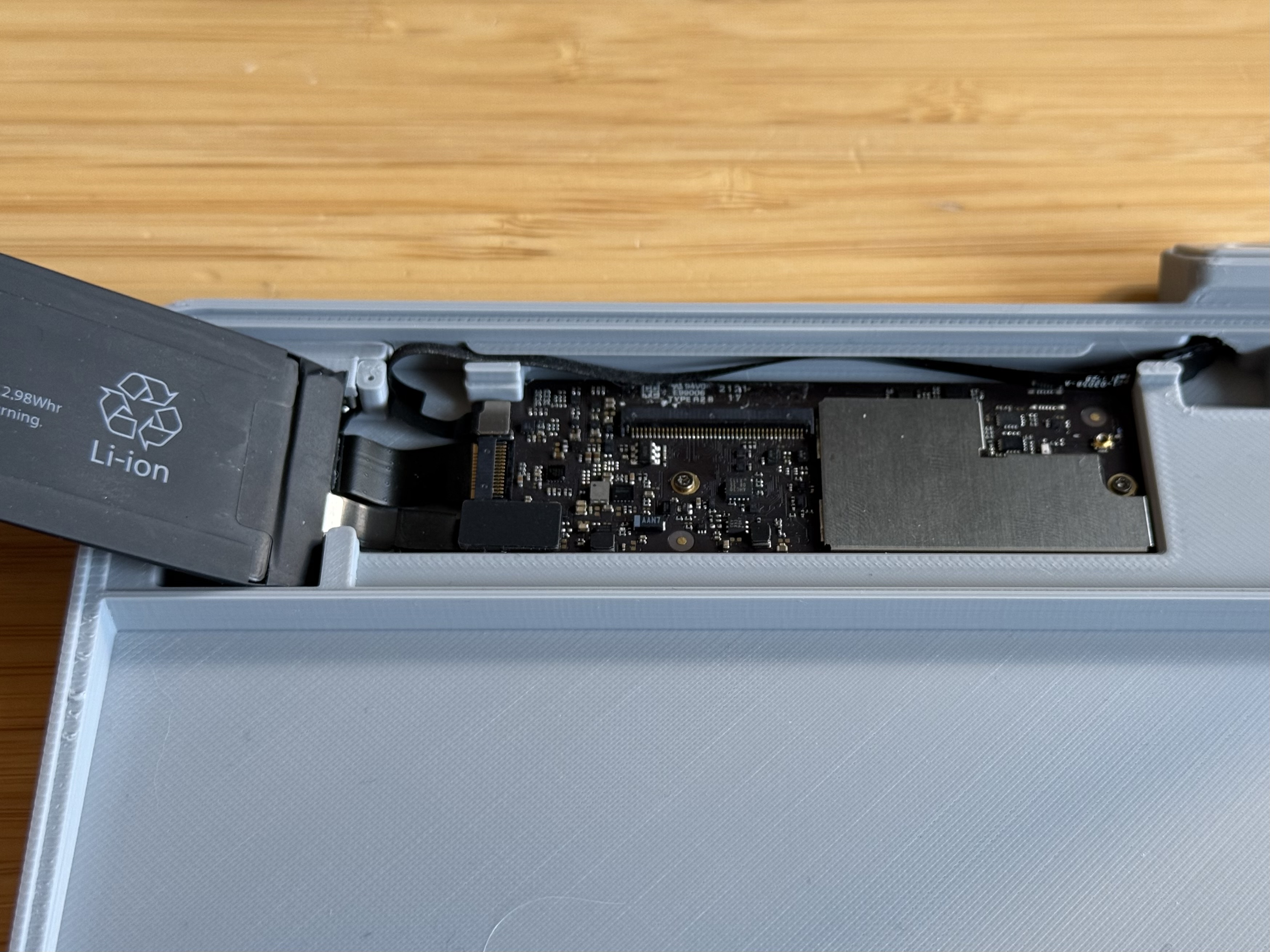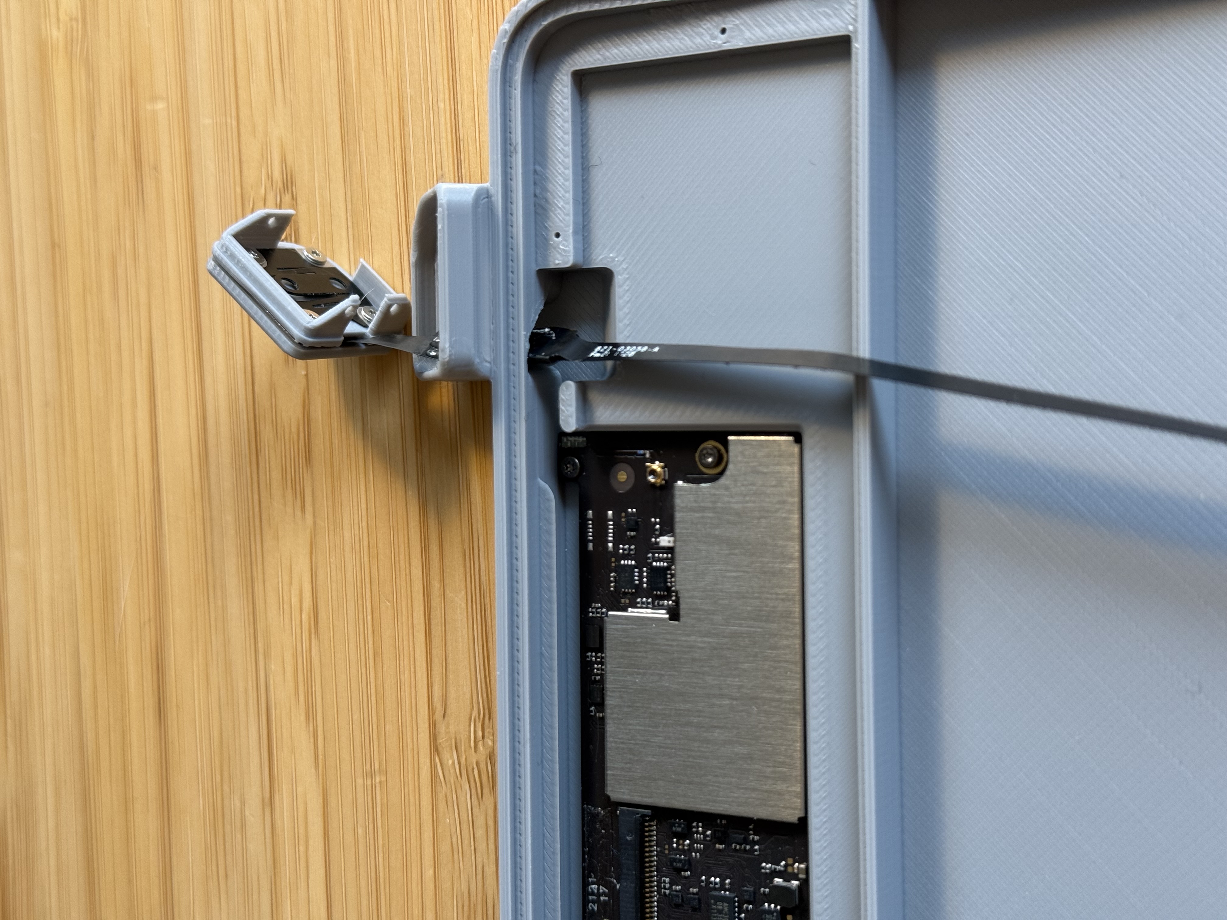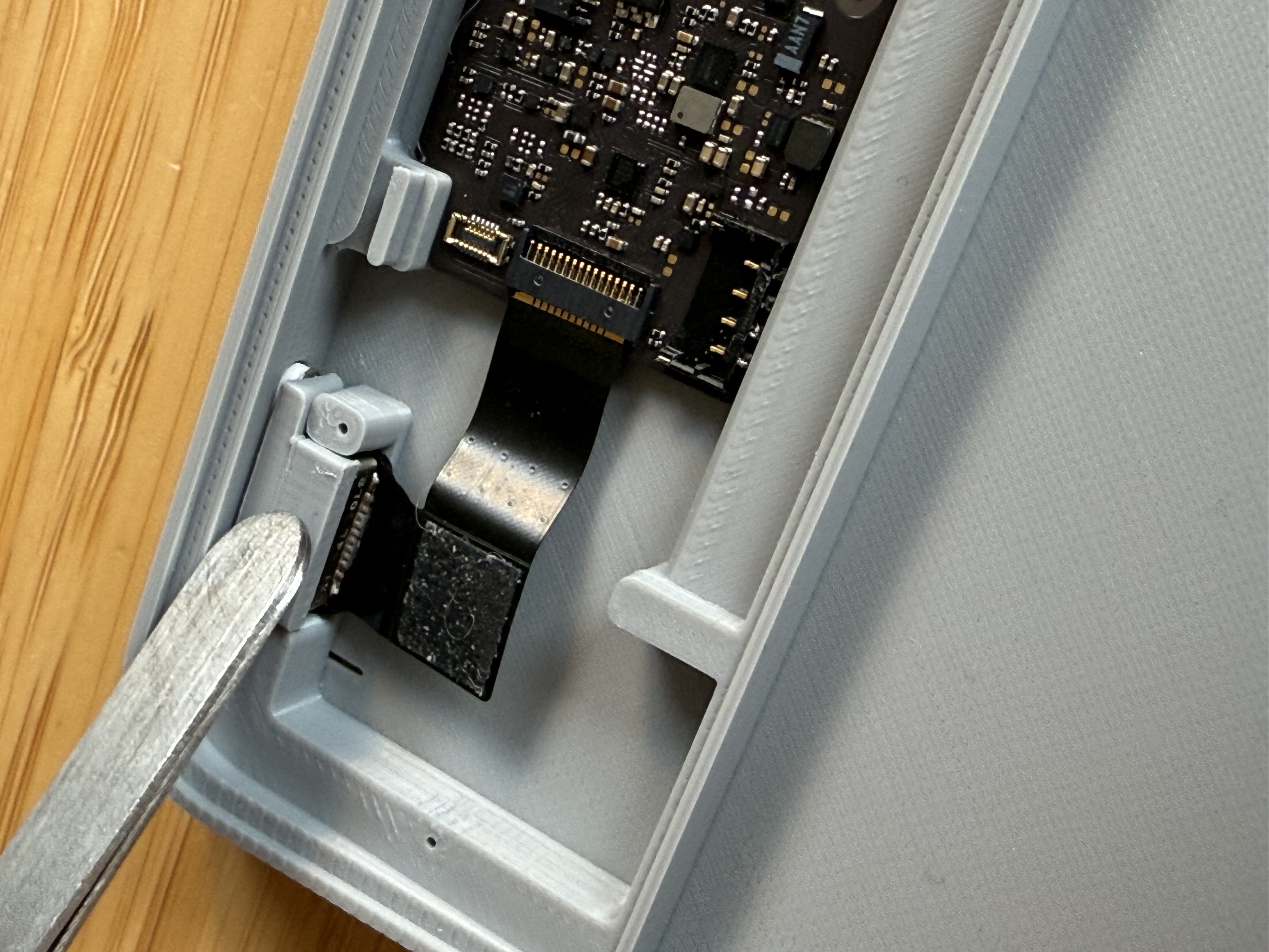 7. Đi dây flex xuống dưới phần gờ đỡ nắp (lid rest) phía trên PCB rồi cắm vào.