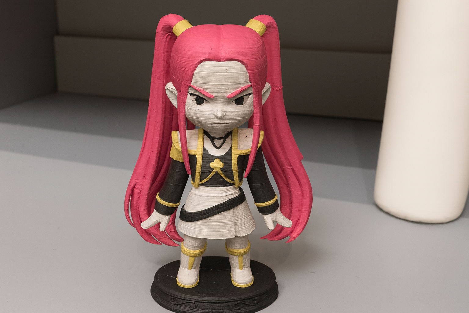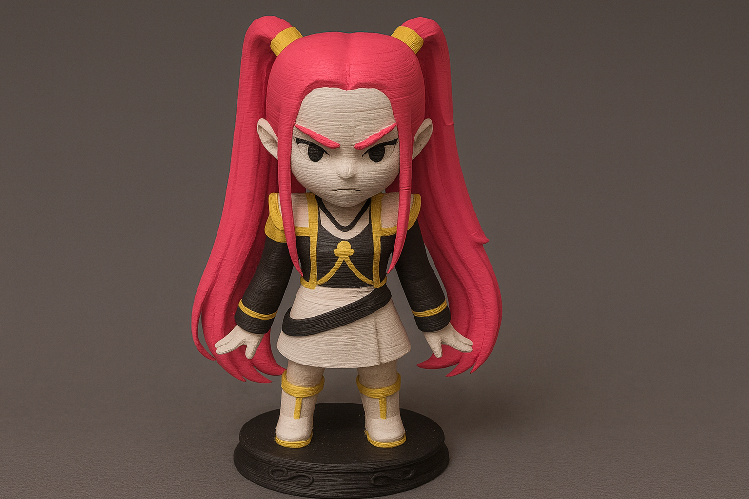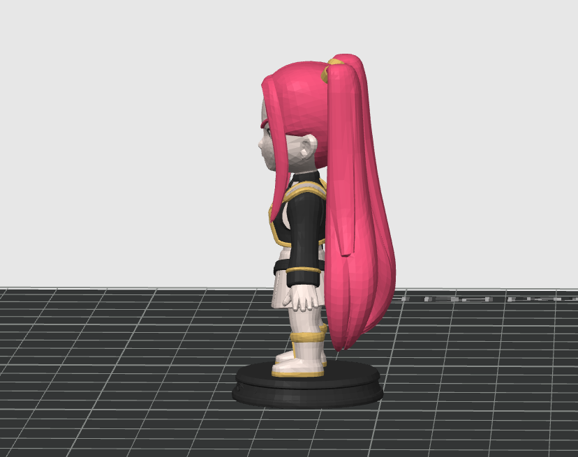 Figure chibi của Mira trong K-pop Demon Hunters, tạo hình hai bím tóc hồng nổi bật, dáng đứng tự tin và outfit nhấn vàng. Kích thước 37.27×28.76×60 mm, supports Auto (Tree), layer height Variable.