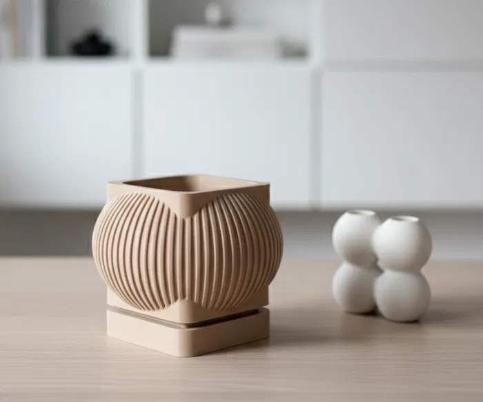 Từ một nét phác thảo giữa đêm, mình dựng mẫu Nordic Planter bằng Fusion 360 theo tinh thần Scandinavian tối giản. Có 3 size miệng 70/100/140mm, kèm khay hứng nước và lỗ thoát (drainage) để trồng cây thật.