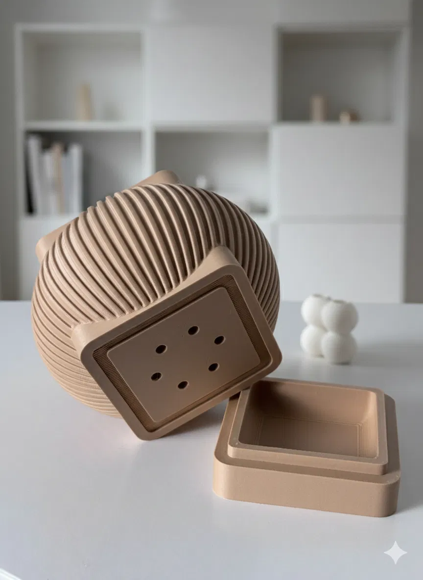 Thiết kế này không chỉ để đẹp mà còn phải xài được. Về kỹ thuật, đây là một "planter": mục đích chính là trồng cây thật với đất. Vì vậy, mình thiết kế lỗ thoát nước (drainage holes) ở đáy để nước dư thoát ra, giúp tránh tình trạng úng và thối rễ.